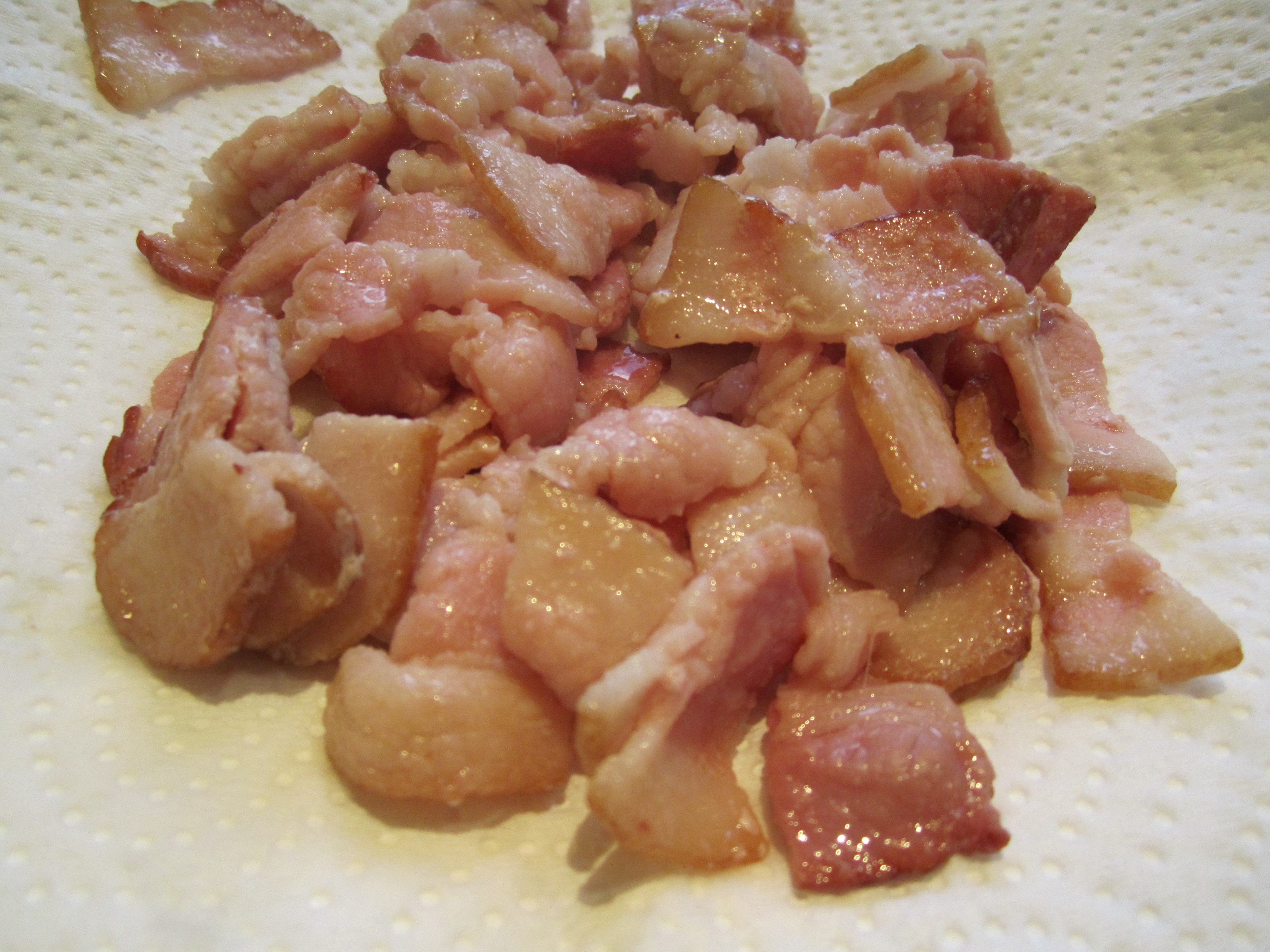 Cut the bacon into chunks while you heat a large, deep pot over medium heat. You won’t need the lid to make this stew. I’m using seven slices of bacon because that’s what was in the fridge. Cook your bacon slightly, making sure to pull it off the heat before it starts to brown. It’s ready when the fat is translucent. Drain the fat off, and let the bacon rest on a couple of paper towels on a plate.