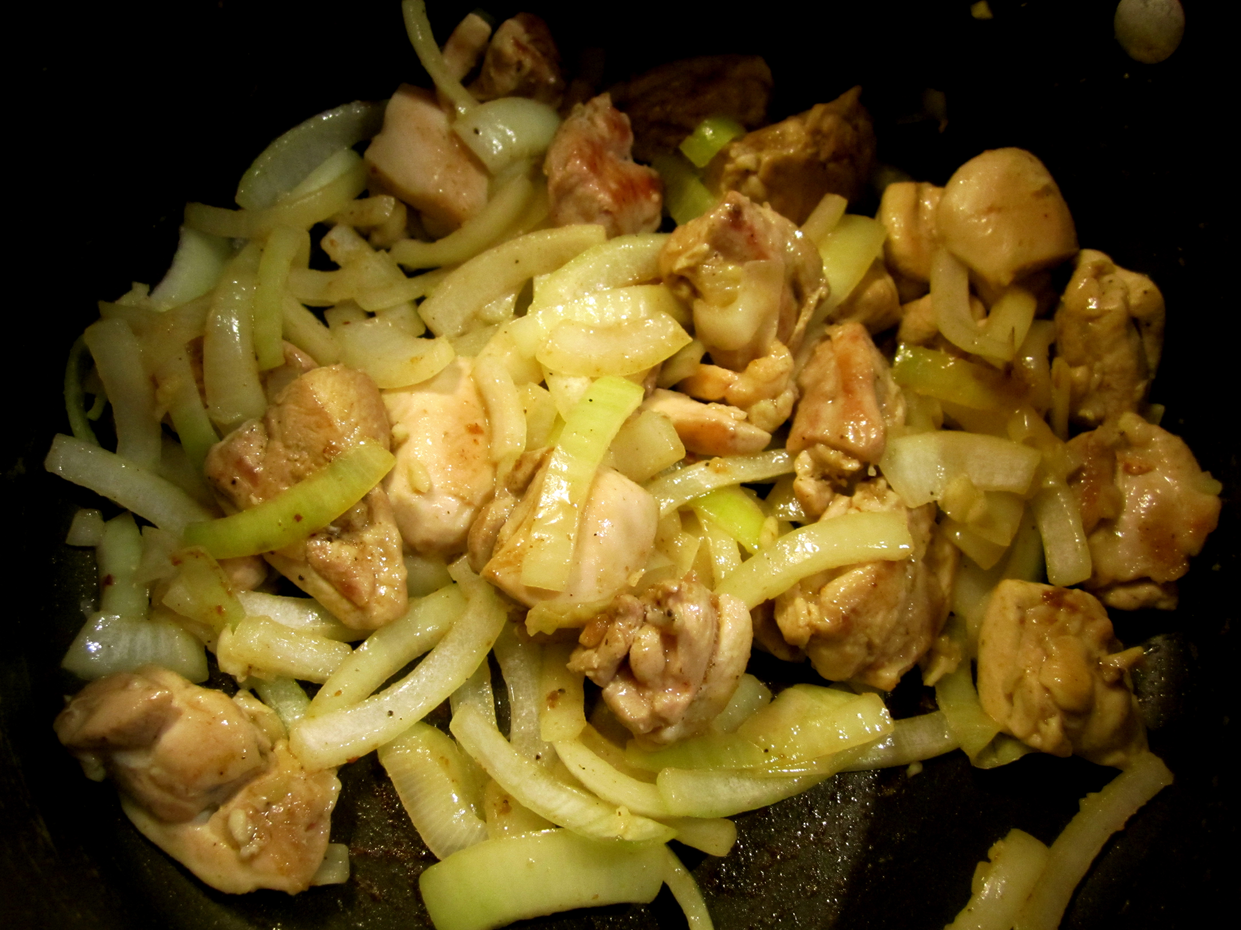 Mix in the onions and let them rock with the chicken for a couple of minutes before you add the garlic. Garlic browns quickly and tastes gnarly if it gets burnt, so watch it carefully. Wait for the onions to be mostly cooked and starting to pick up browning off the chicken.