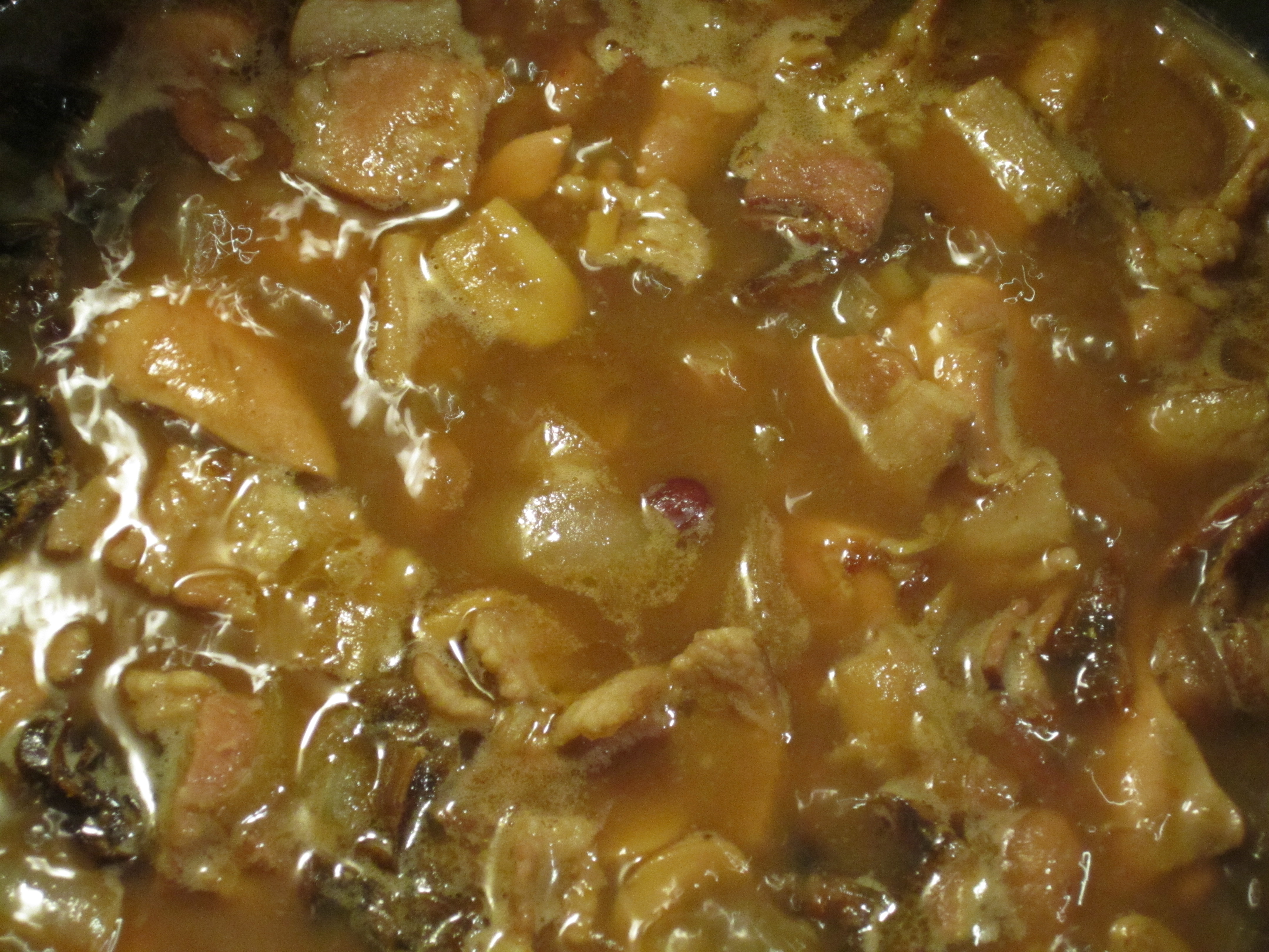 While the bacon is cooking, cut your chicken into chunks. I used six thighs. This stew is going to cook for a while, so you want to avoid cutting the meat into little bitty pieces that will break down too quickly. To me, a stew needs a robust presence. Season your chicken with black pepper and a couple pinches of cumin. Don’t add salt yet, because the chicken is going to brown in the same pot we used for the bacon, and we don’t want a briny stew.