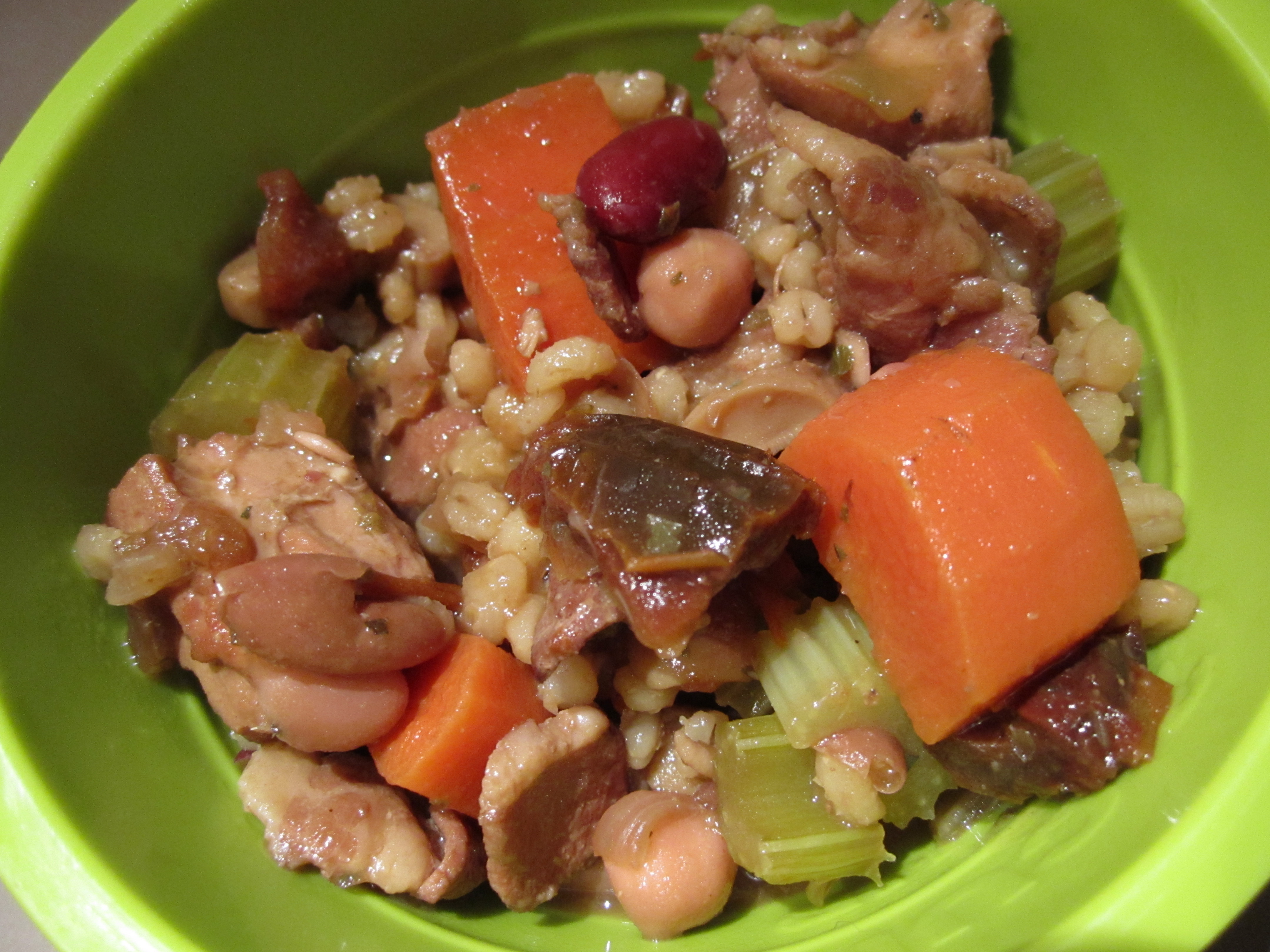 When you’ve let it simmer for at least 30 minutes, fill the empty bean can with water and add it to the pot. Repeat and then toss in two full handfuls of pearl barley. Stir it all up and give it about fifteen minutes to cook while you prep the last couple of ingredients. Peel and slice three carrots, and dice up four stalks of celery. Clearly, you could use more or less of either, but make sure you put the carrots into the pot first because they take longer to cook. Allow them a couple of extra minutes.