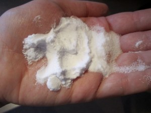 Add a two big handfuls of flour. On top of the flour, sprinkle three pinches of salt, and some baking soda. Mix it all in. We want to add the coconut and oats now, or they won’t mix in nicely after the dough gets stiffer. I use a heaping palmful of coconut and two palmfuls of rolled oats. Mix it all in.