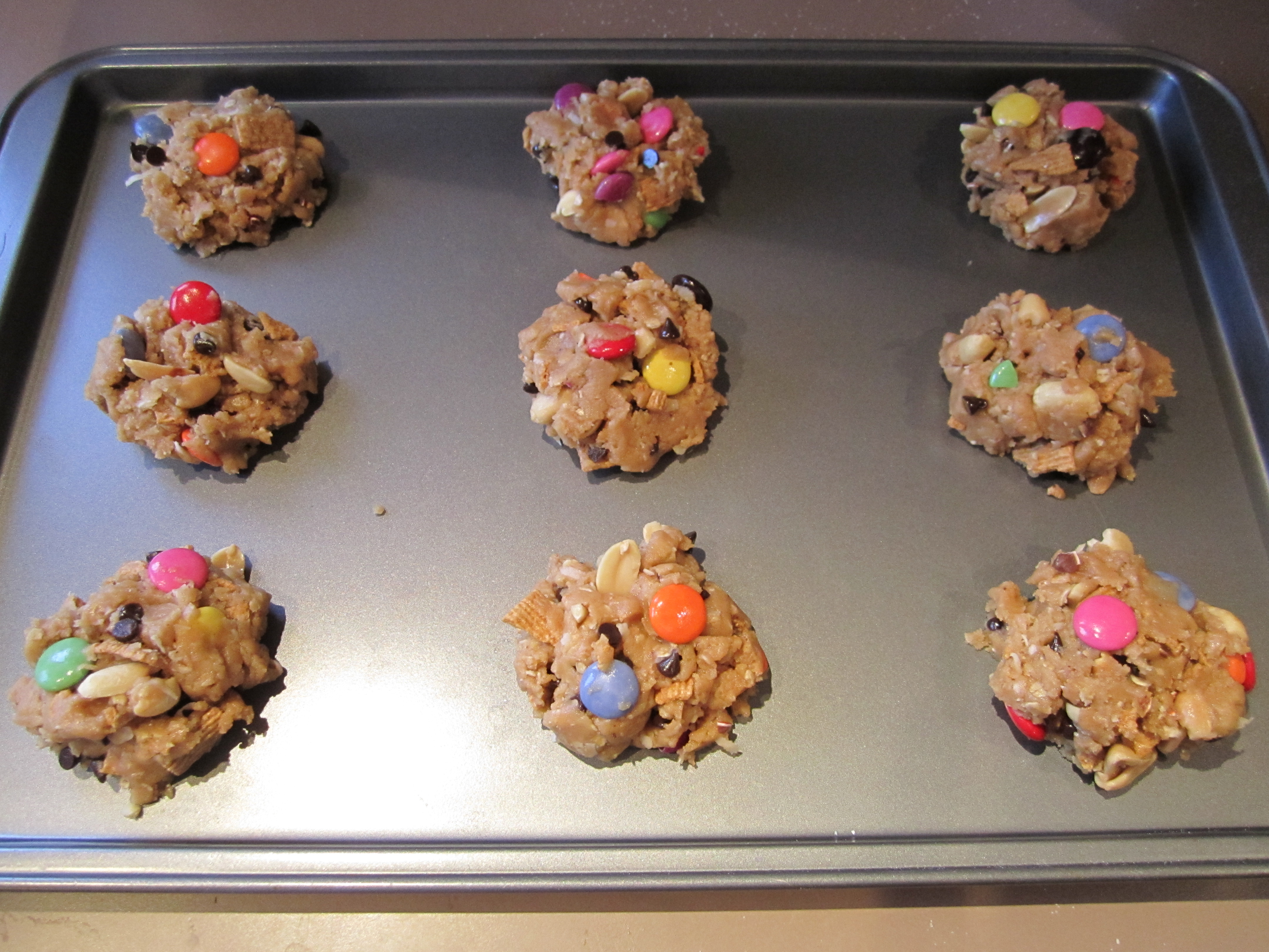 Everybody loves monster cookies. Apparently everyone also has a recipe for monster cookies. I make a monster-esque cookie that can’t rightly be called a monster cookie, since it contains flour. Also, mine call for at least one thing you’ve never put into cookies before.