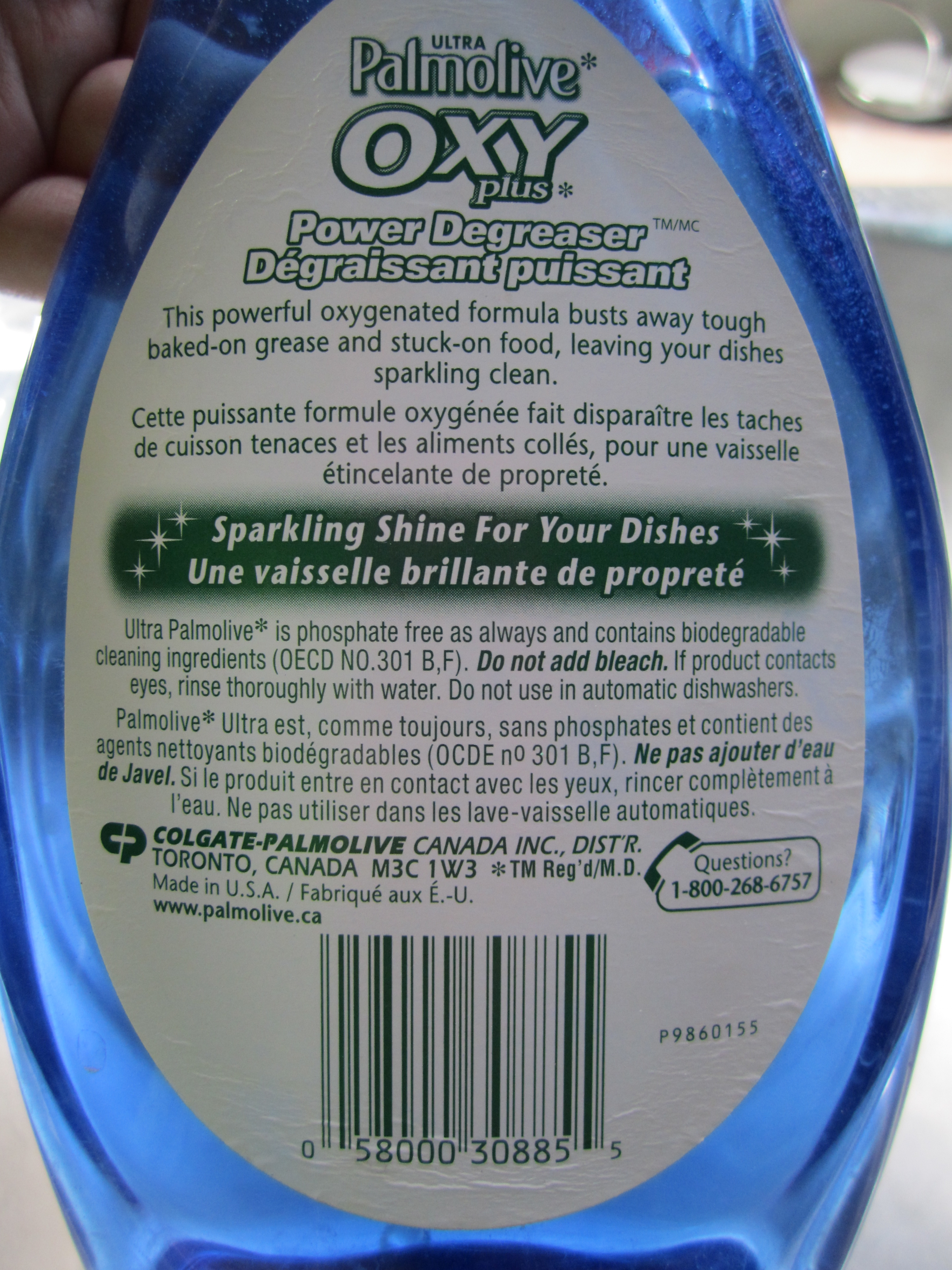 I am peeved with Palmolive, because the “warning” on the back of the bottle is tiny and unclear. They’ve chosen to “warn” me about mixing with bleach just before the note about what to do if I happen to get in in my eyes and the statement that I shouldn’t use it in automatic dishwashers. The note about bleach therefore feels akin to telling me that putting their soap in my eyes will sting like heck or that putting it in my dishwasher will cause a foam party in my kitchen. Thanks Palmolive, but I don’t have an automatic dishwasher. Way to rub it in. Jerks.