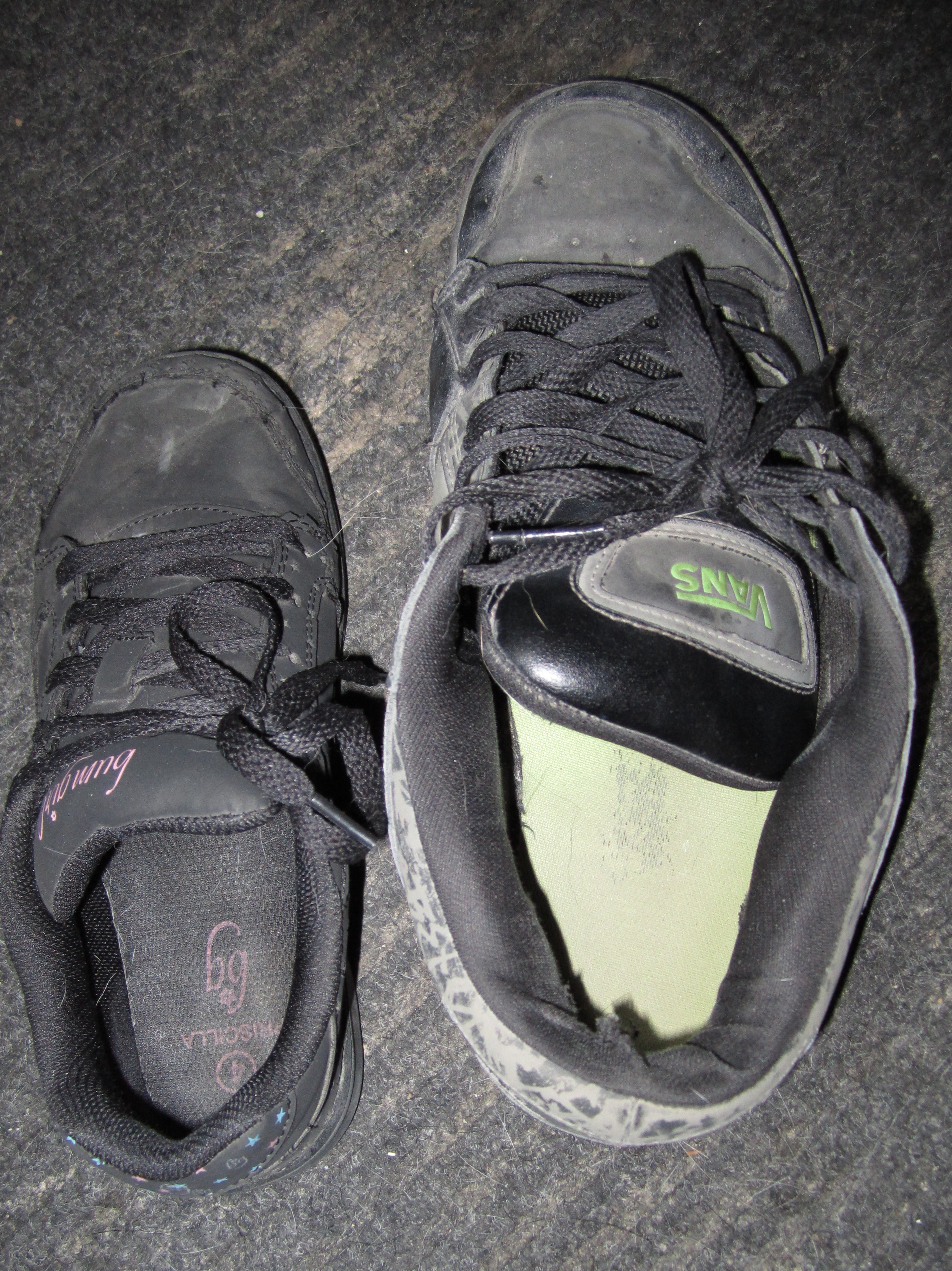 I don’t know why I would rather risk tripping and breaking my face wearing The Electrician’s sneakers than take the time to put my own little shoes on properly. I think it’s a good example of one of those little things we do to save time that thwarts us in the end, like changing lanes when traffic slows down or turning the burner up only to burn dinner six minutes later.