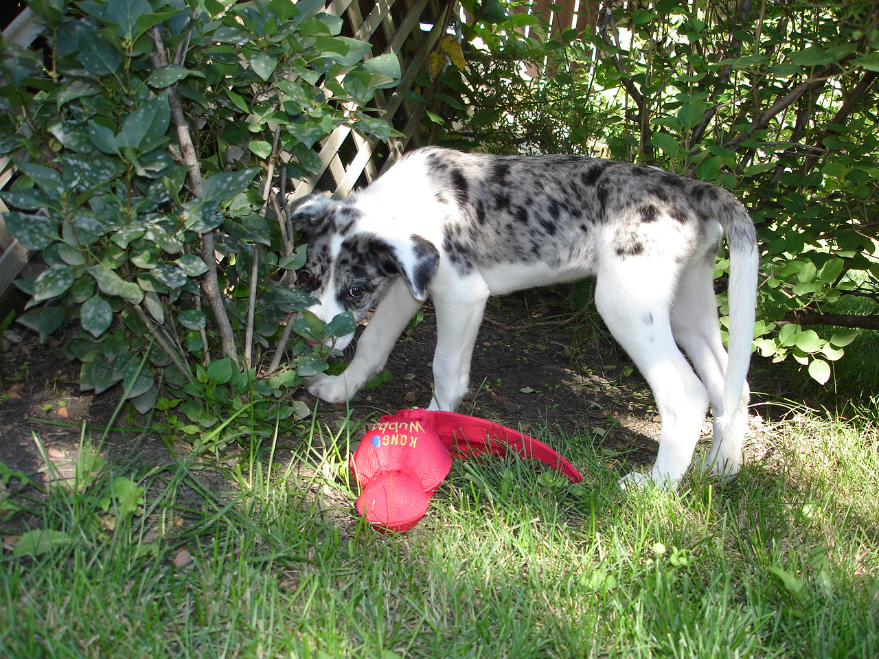 Sherman has quite a few toys out back. He has a soccer ball and a purple rubber squirrel. He has a couple of tennis balls tethered together. He has a plastic ball with another little plastic ball rattling around inside it, designed to drive him crazy and buy me a little time where I don’t have to entertain his hairy butt. Sherman is the most spoiled puppa-doo on the block.