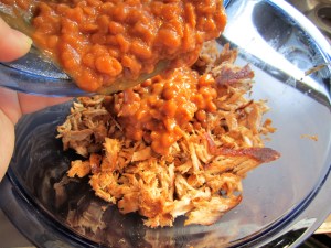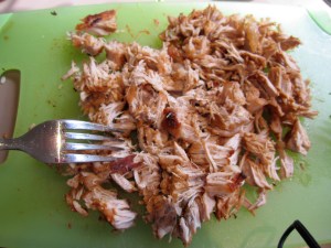 Although a little dark on the bottom, the pork wasn’t actually burned, so I could continue on with it as I’d planned. I let it cool a bit, and then tore it apart with two forks until it was nicely shredded. Try to avoid too fine a shred here: we want a pulled-pork effect, not a dish with a filling that resembles high-end cat food.