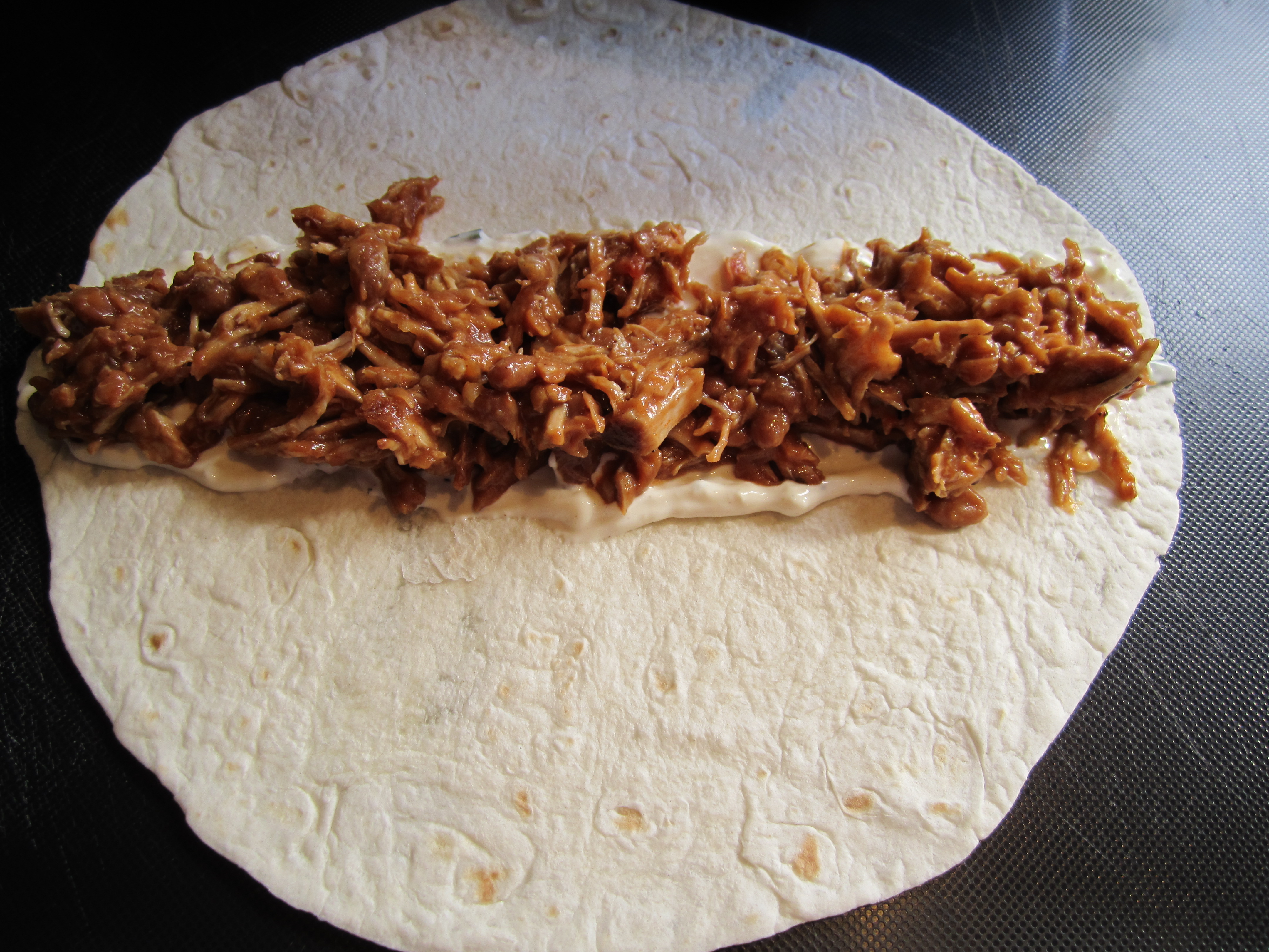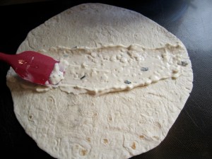 Now for the fun: assembly makes me feel so accomplished! Lay out one tortilla on a cutting board or something flat that’s easy to wash. Run a generous spread of your cream cheese mixture down the center of the tortilla, and then follow that run up with a few generous forkfuls of the pork and bean stuff.