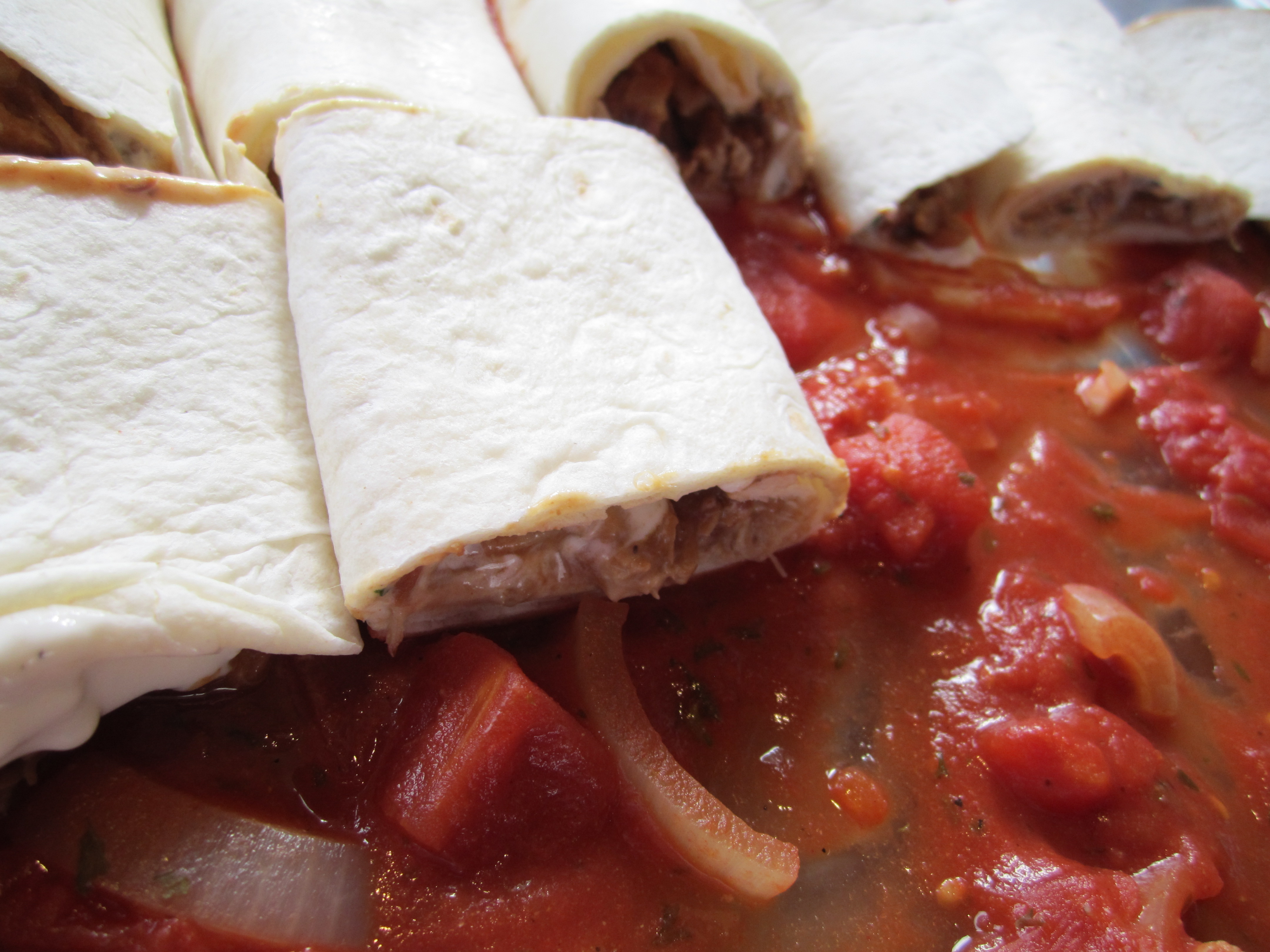 Arrange the tortilla rolls tightly together in the pan, and then spread the remaining tomato sauce over top of the works. Sprinkle the cheese evenly over the top, then pop the whole enchilada (yes, I’ve been waiting to use that line the whole I’ve been building this post) into the oven at 300ish for about 40 minutes or until the sauce is bubbling in the middle.