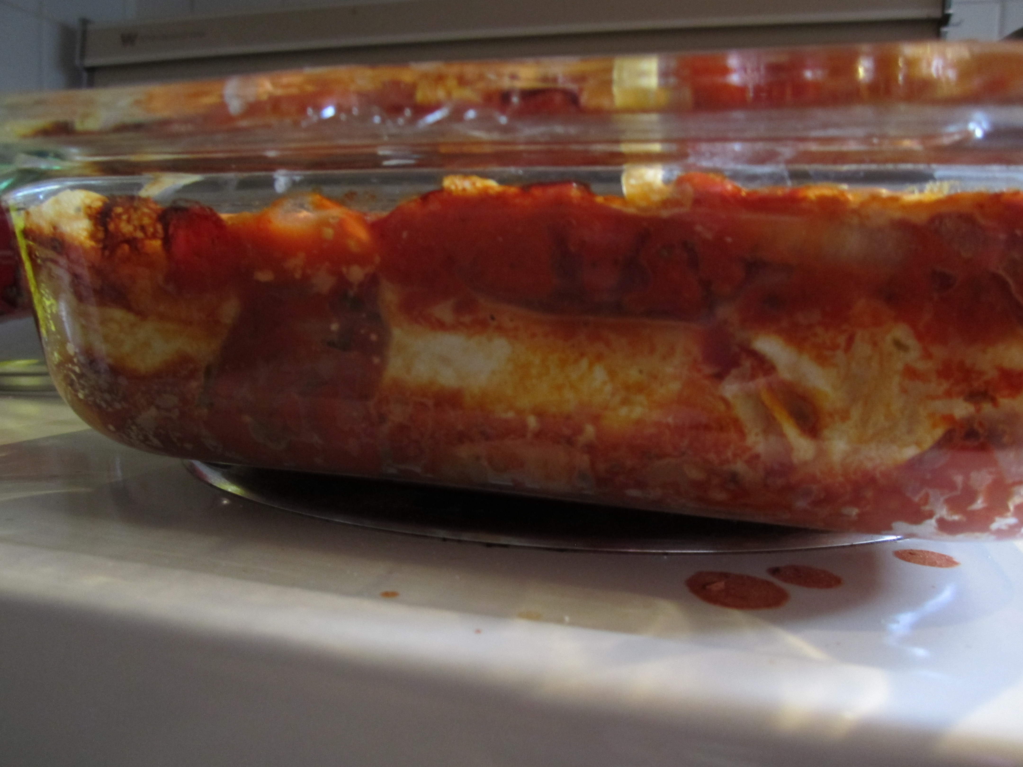 I was feeling so proud of myself, making this lovely homemade dish for the little party tonight, and looking forward to unwrapping my casserole dish full of quasi-Mexican goodness. While my porkchops were simmering lightly, I barbecued the rest of the package of meat and made some rice and a salad for a lunch for me and The Electrician. Before we ate, I added a big slop of water to the tomato sauce in the frying pan to keep things moist and happy.