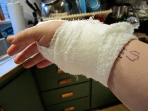 This is a photo of my poor paw about 30 hours post-op. It’s wrapped up, doctor’s orders, until noon on the 3rd, which is fine with me, since I’d rather not see the Frankenstein’s monster look I’ve got going on under all the gauze.