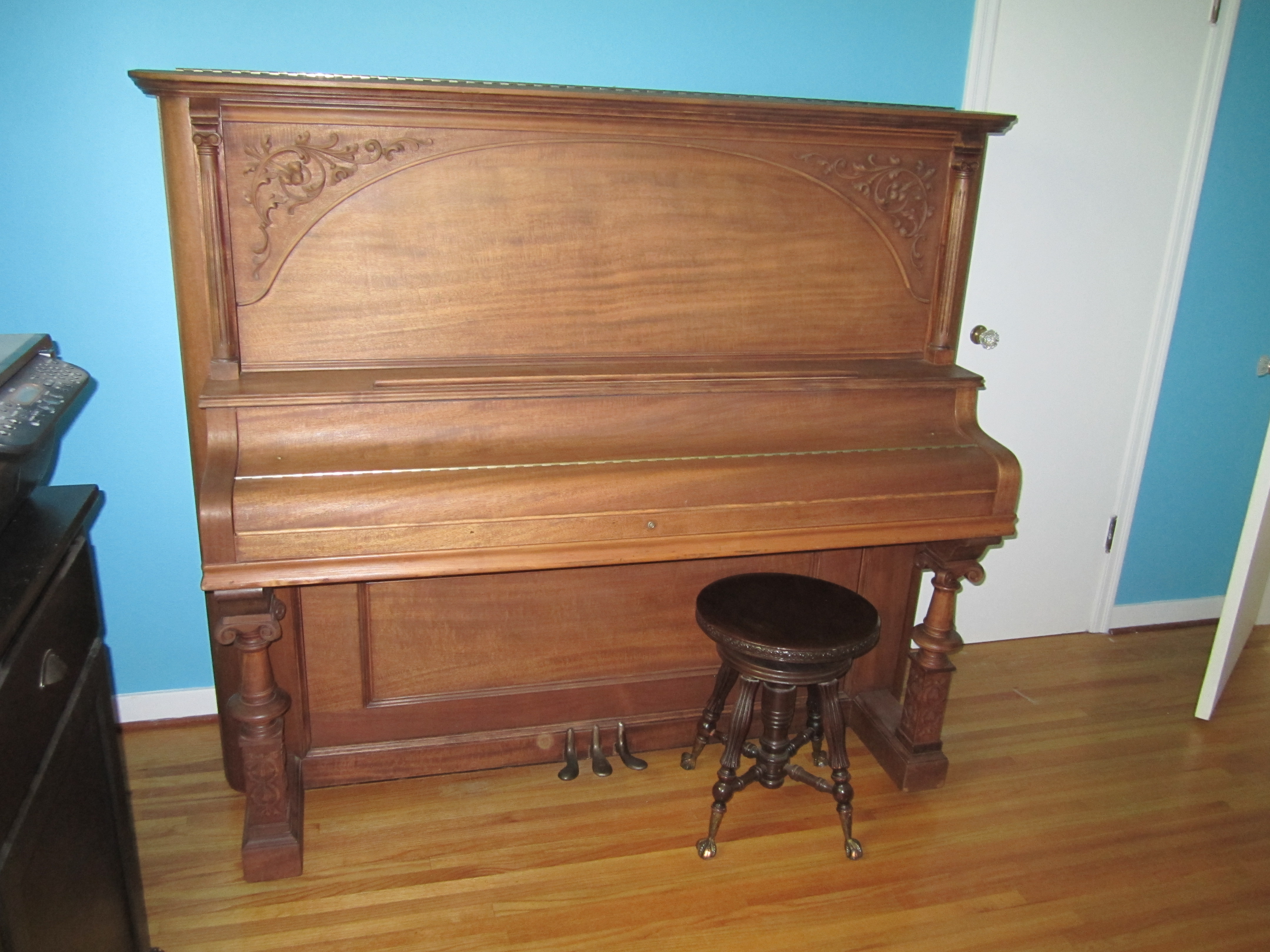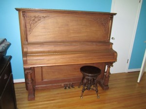 So, today three rather burly men wrestled a piano up the front steps and into the dollhouse. It’s over one hundred years old, but the piano is a stately old gal.