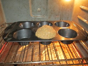 Next, spray a your muffin tin(s) liberally. For Sherman, who is about 65 pounds with his collar on, I used my jumbo muffin tins, and it took about three quarters of the mess in my mixer to build my pupcake. If you wanted to, you could certainly use a regular or even mini muffin tin; I also think the cakes could be made and frozen without frosting. You’ll want to press it down firmly with a spatula, being sure to pack it tightly into the tin and then round the top. It is not going to rise at all, of course (in fact, it will lie there like last week’s roadkill) so you need to make sure it’s the shape you want before putting it into the oven.