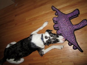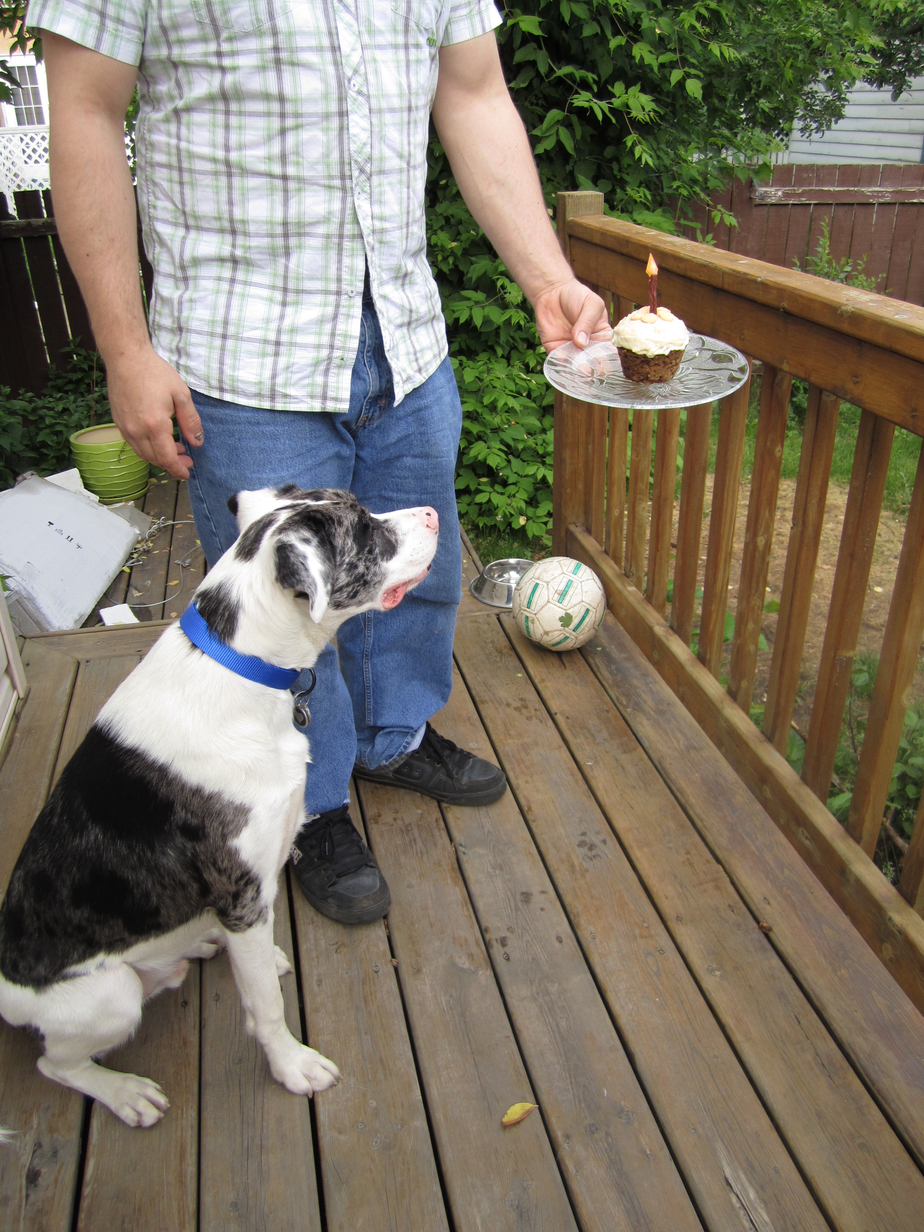 I’ll take this opportunity to state that Sherman is treated very well, and he is “spoiled” in the sense that he has lots of toys, is walked regularly, and lives a pretty cushy life for a hairy beast. Part of that for me, though, is that he has to hold up his end of the deal. There is no free lunch for the dog in this house; Sherman works for all his treats and tidbits, and he is expected to follow commands and stick to the rules, which is why you see him waiting to have his pupcake. He is trained now to the point where he will not touch his food until he’s given the okay to start eating about 95% of the time, which I consider sufficient for a one year old dog.