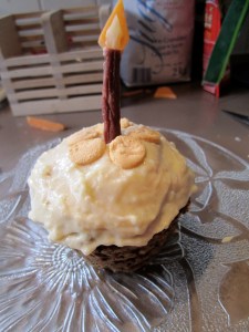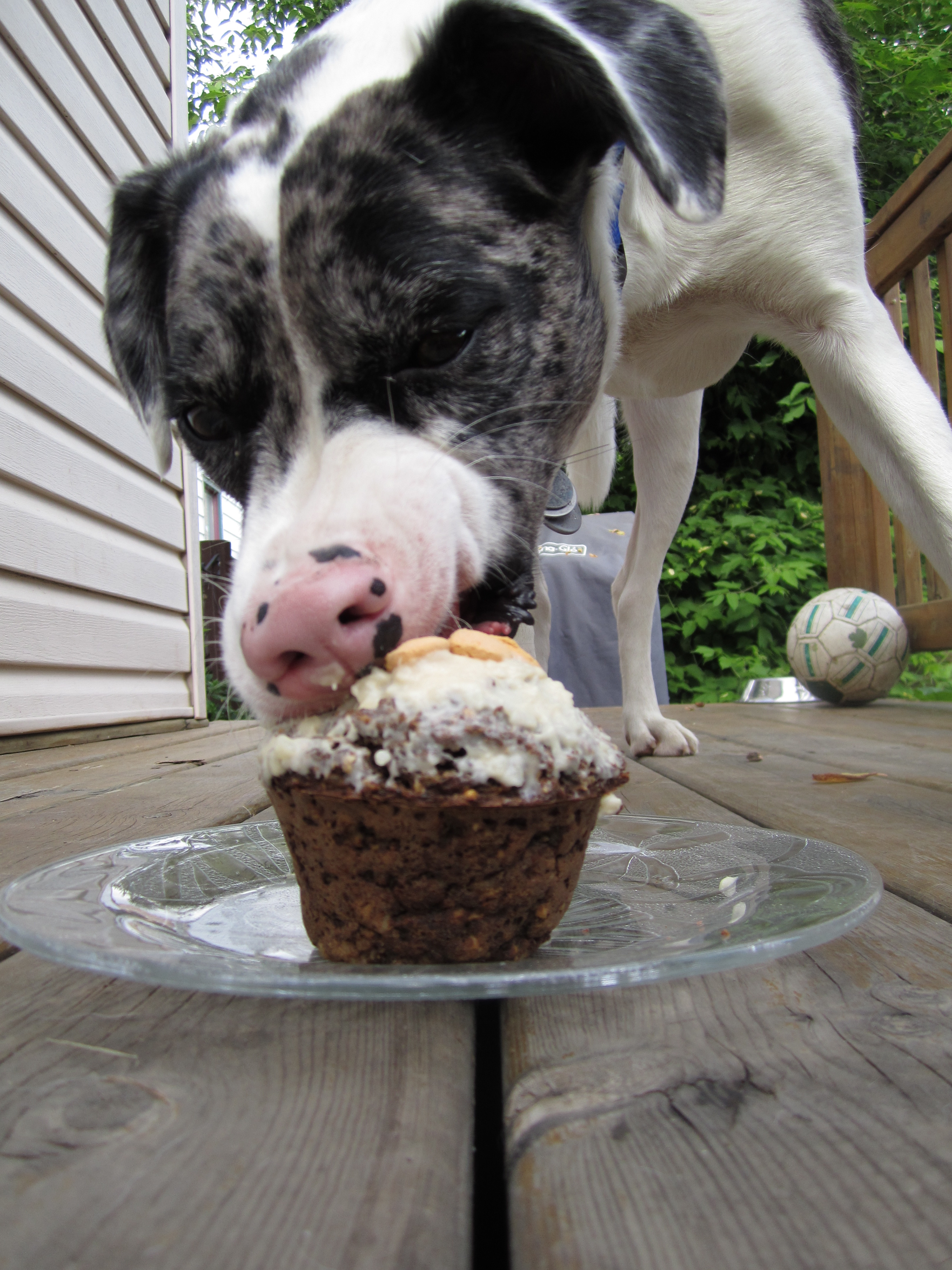 I frosted the pupcake with a dog safe “icing,” which I made by beating the snot out of one peeled, boiled potato and about a tablespoon of peanut butter. I recommend using a plain (real) potato, and not powdered mix because the dehydrated stuff usually contains lots of extra salt and flavourings that are not ideal for your canine friend.