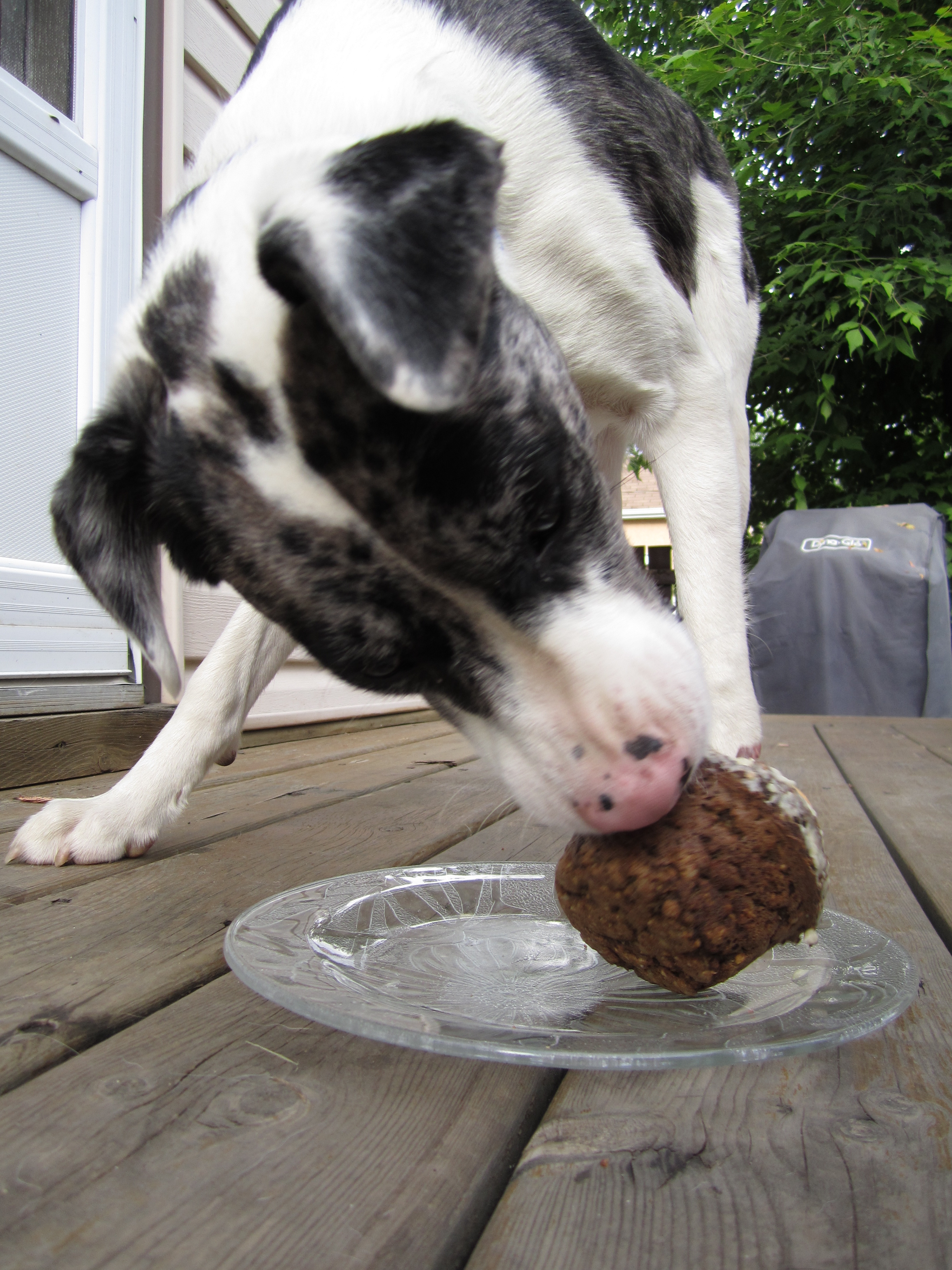 This is the treat I made for Sherman’s birthday. I decided to make him a cake because a first birthday should not go by uncelebrated, and I thought my spotted stink machine needed something extra special to mark the occasion. That said, I was not willing to give him “people” food or anything that is inappropriate for dogs, so I concocted a puppy-safe sort of meatloaf. His birthday should not be about him having a belly ache and then farting the night away. (He farted the night away, as usual, but there was no belly ache involved.)