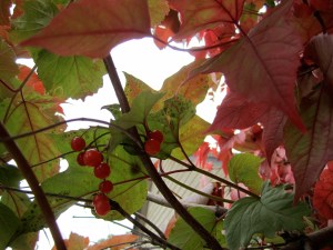It might be some kind of maple, based on the shape of the leaves, but there are also shiny red berries. I’m not sure what to make of it, but chances are very good that the magpies who torture poor Sherm in the backyard will be getting right drunk on those berries once they start fermenting. Yeehaw!