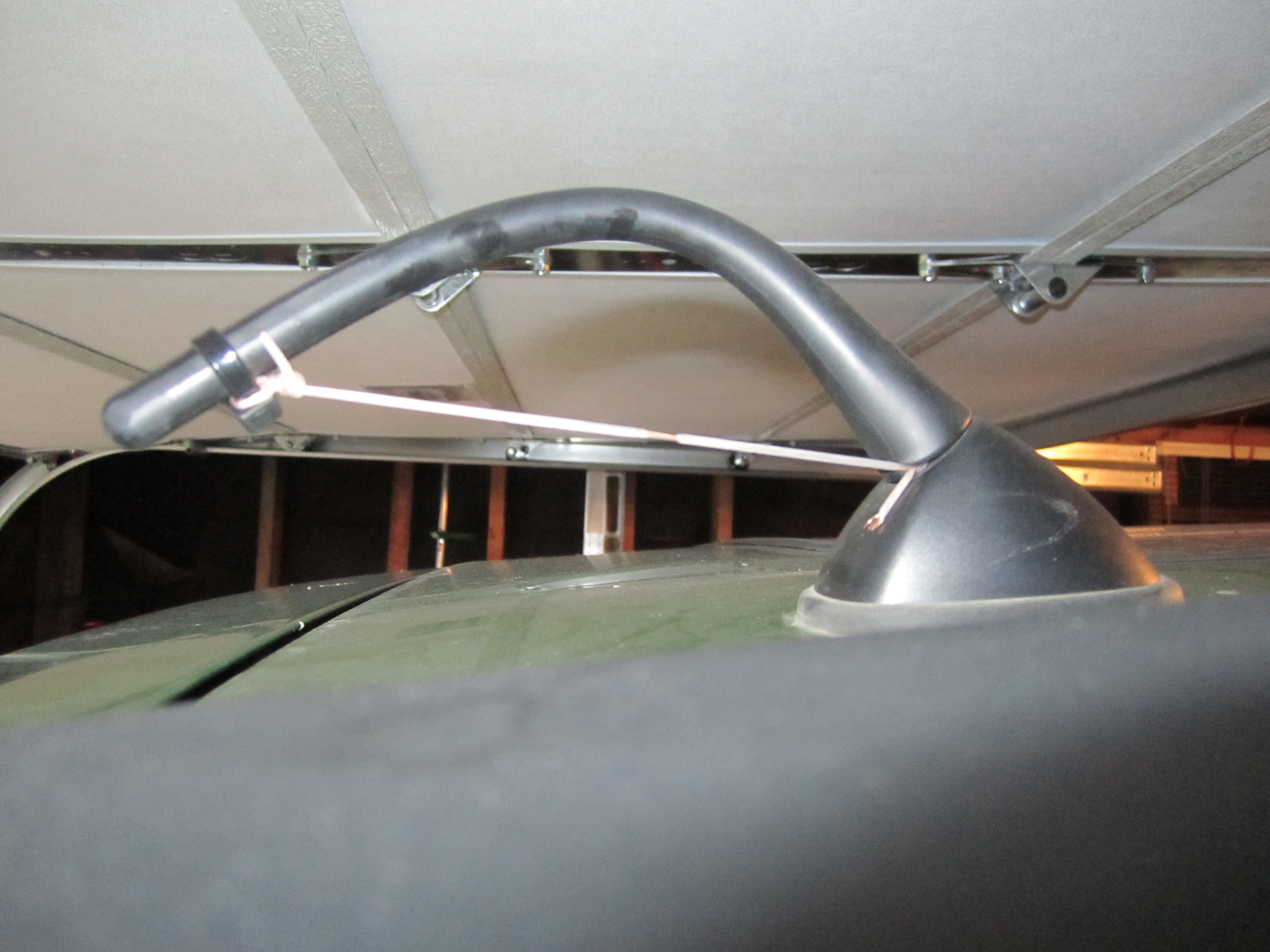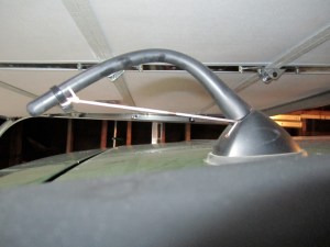 I tossed out some words I refuse to repeat here on my family friendly blog, but one rhymed with “boil,” and went inside to stew about the issue. My solution, with a little input from my dad, involved fashioning some sort of antenna deflector on the damaged door panel to prevent the twang and save my beautiful new door. The Electrician and I went out to do a little shopping, and I remembered to ask him about it as I pulled back into the garage. Our conversation went like this: