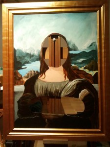 To “be” the Mona Lisa, I basically wear the costume like a remarkably bulky kitchen apron. There’s a curved padded strap, borrowed from my duffle bag, that rests across my shoulders and keeps my face in the right spot. Another strap, borrowed from The Electrician’s duffle bag, secures it snugly around my waist. Both straps hook up to some kind of bracket used to secure electricial conduit, hardware my sweetie has used many times, but never in the context of wearable “fine” art. The costume looks heavy, but it’s more awkward than anything else. I quickly got used to shuffling through doorways sideways like a sand crab, and didn’t get stuck anywhere.