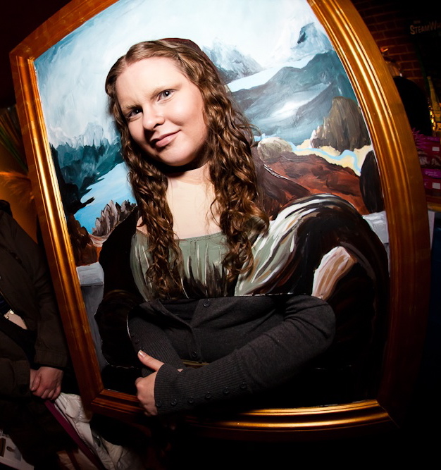 Here I am up close in my Mona Lisa costume. The photo is distorted by the type of lens, I think, so keep in mind that my head appears much larger here than it is in real life. I promise I do not look like a renaissance Pez dispenser on a day to day basis.