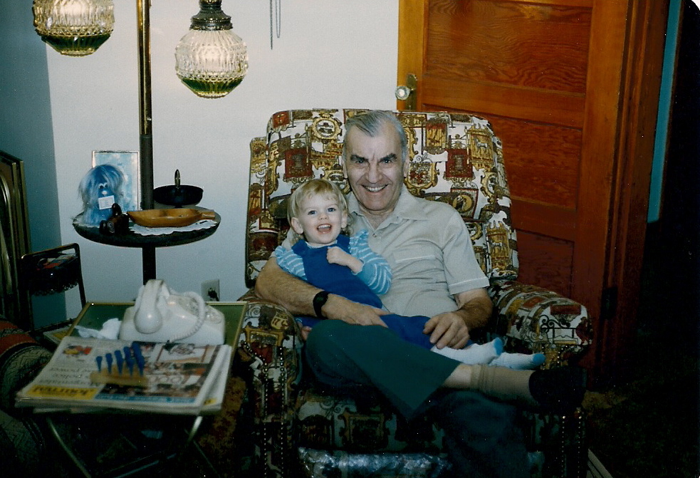 This is an old, old photo of me and my paternal grandfather. When I was very small, I climbed into his lap whenever we stopped in to see him and my grandma, and I stayed there for much of our visit. Thinking back to those visits, I mostly remember laughing. Grandpa tickled me until I had tears on my chin; he pulled ridiculous faces that had me roaring as much as a tiny kid can roar. Once all the giggles had subsided, and I started to think we might start a bit more serious conversation, Grandpa would suddenly snap his bottom dentures forward and out, like nothing so much as the drawer in a cash register, and I’d crumble into hysterical laughter again.