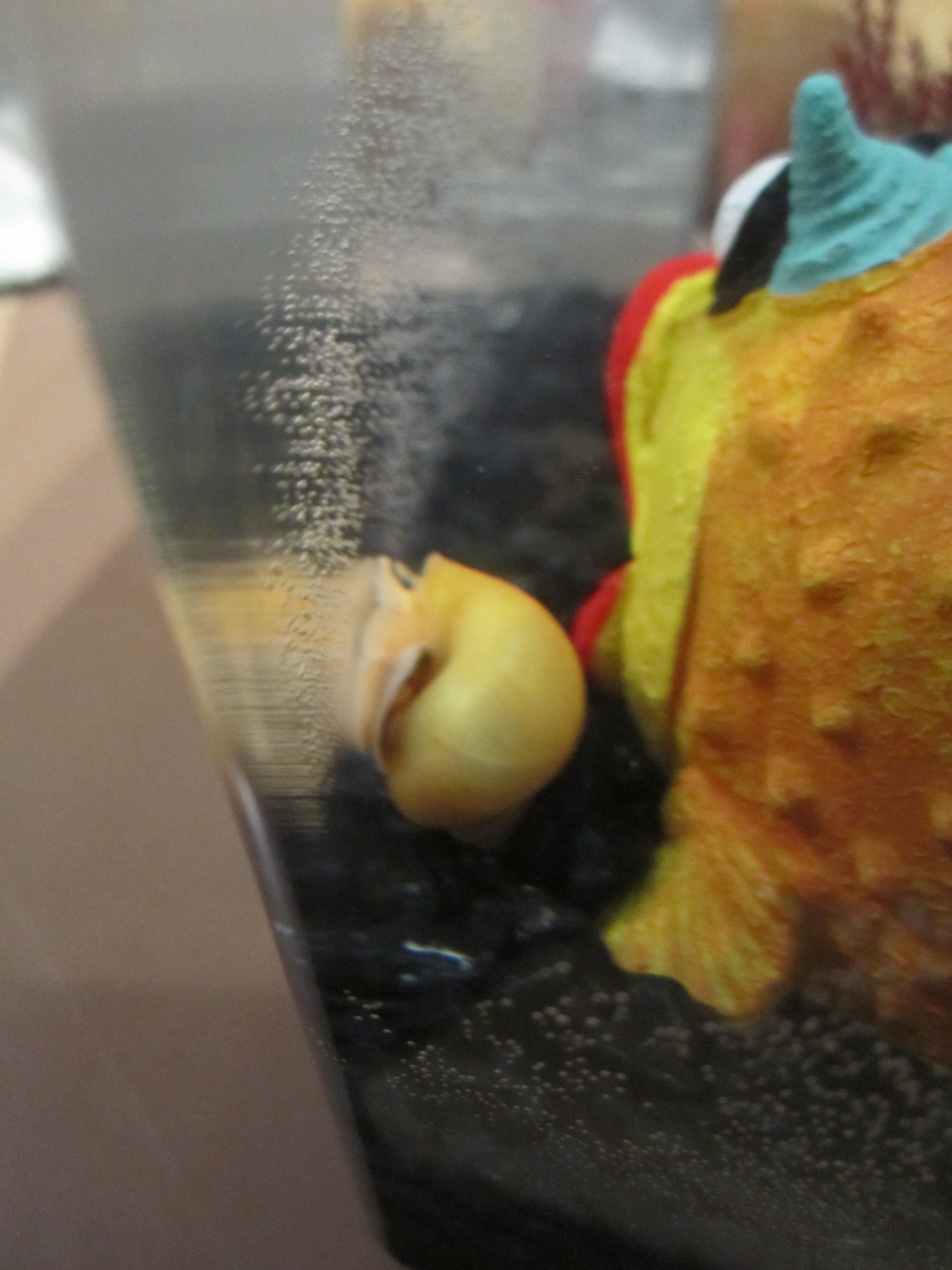Ms. S. Cargo is some sort of mystery snail, which is apparently the actual name of this breed of gastropod, and she’s pretty yellow and pretty cute too. She has speckles on what I assume is her face, so she fits in around here. I had a snail cleaning up after my goldfish years ago, and my friend remembered how cool I thought my former snail was and picked out Stevie for me.