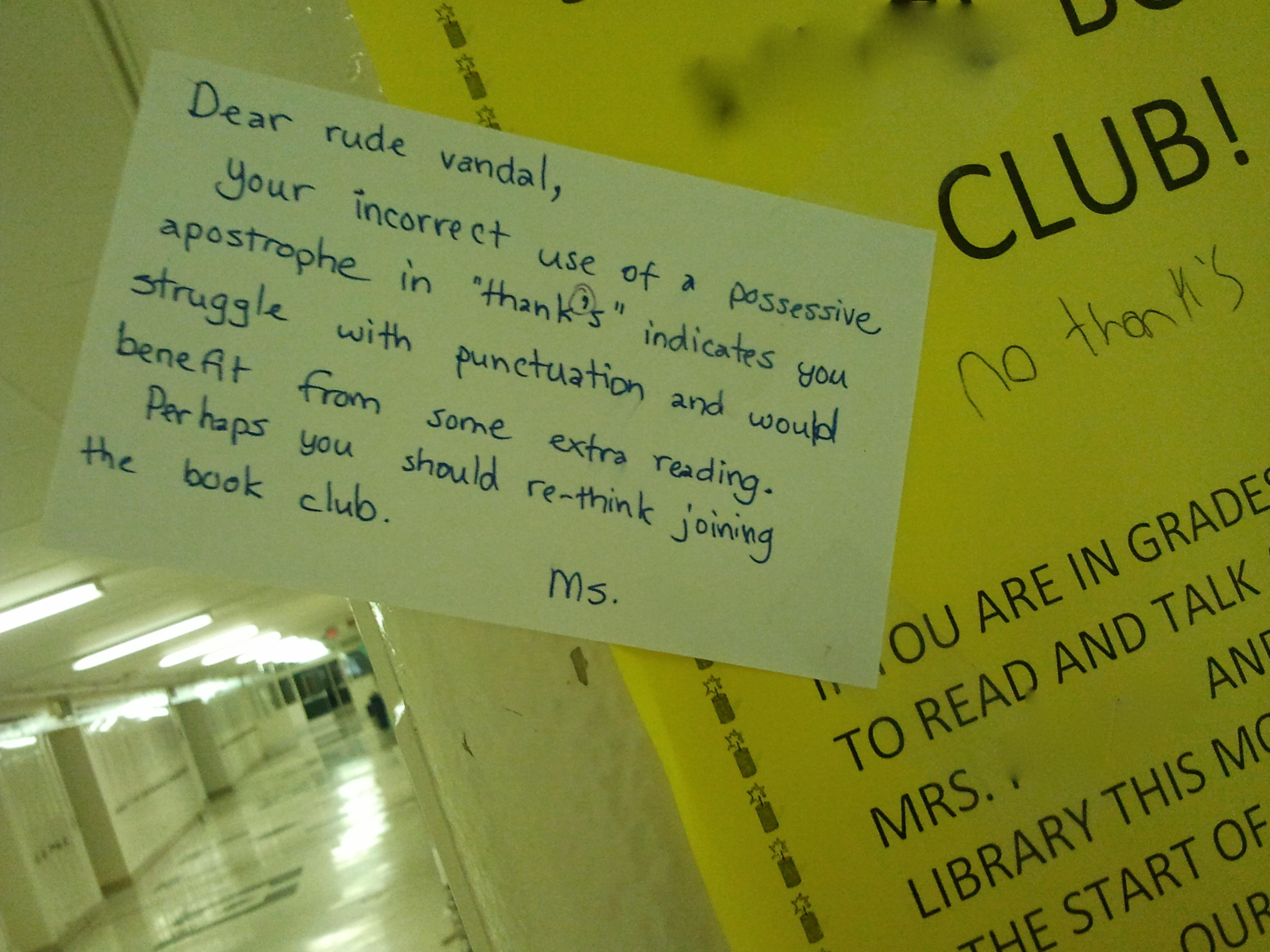 At the end of the day today, after I’d already punched the button on my keychain to warm up my Element, I noticed someone had sloppily scrawled “no thank’s” in ink on the book club poster. As one of the few, the proud, and the anal who have taken a sacred vow to uphold the rules of punctuation and intervene when those rules are broken, I was forced to react. I dropped my bag loaded with marking right there in the hallway and stormed back to my desk to respond to the atrocity.