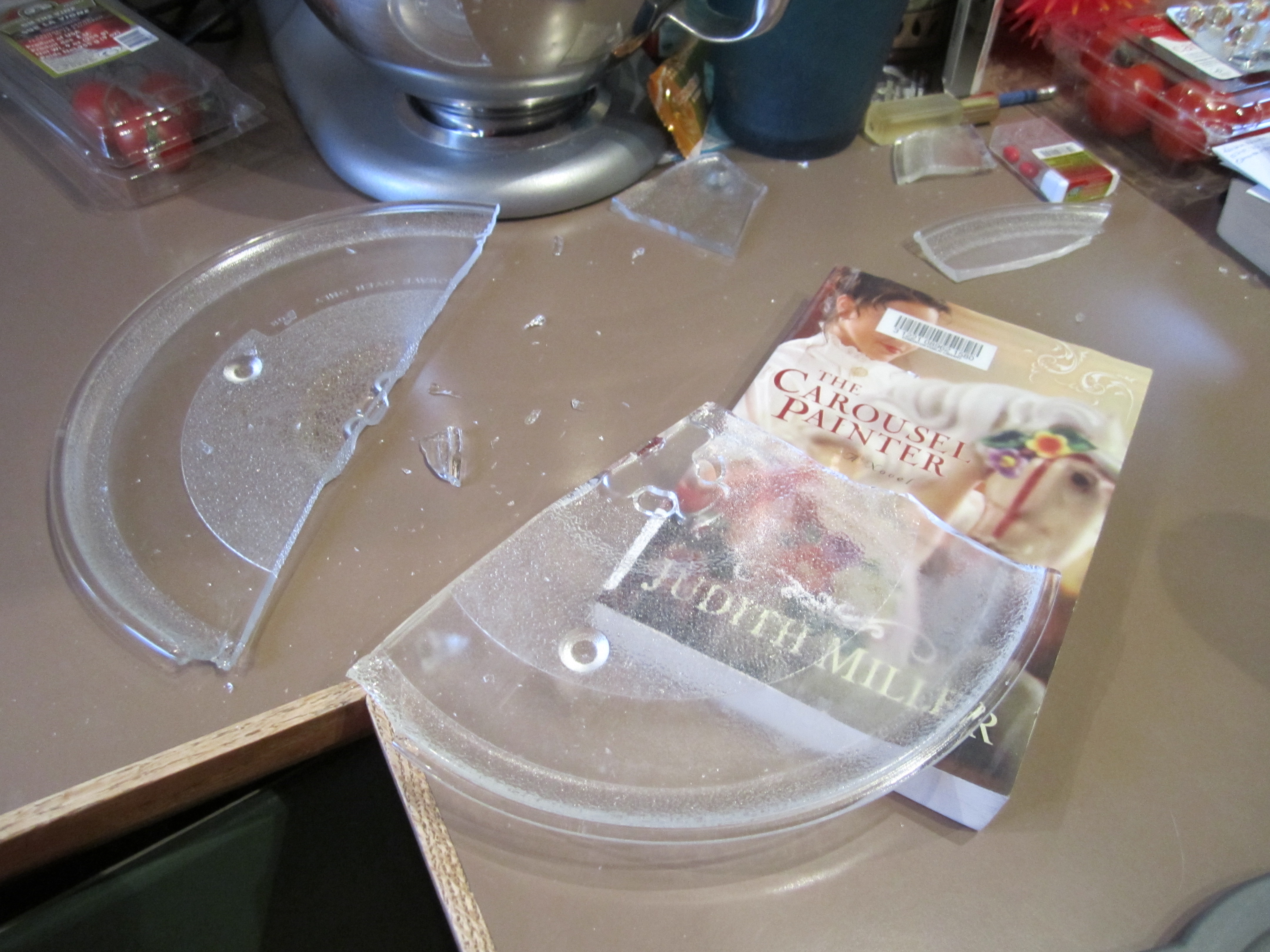 At some point as I struggled to pull my meal out of the microwave with my partly numb morning hands, I guess I must have caught the bottom of the bowl on the edge of the big glass platter that spins around in the bottom of my microwave. I saved the Fiestaware, but the turntable slid out of the microwave, glanced off the bowl of my stand mixer, and broke into numerous very sad pieces on the countertop.