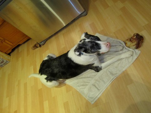 Finally, Sherman started moving in the right direction. He eased himself slowly onto his towel, where he’s trained to chew his treats and gnaw his toys. See that big brown lump on the right side of the photo? Yeah, that’s a beef knuckle. It seems Sherm isn’t satisfied with his dog yummies. He wants what the rest of the family is eating. Spoiled brat.