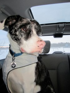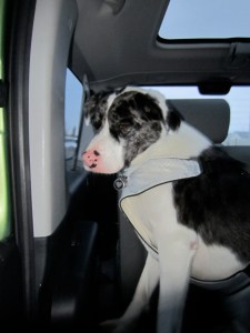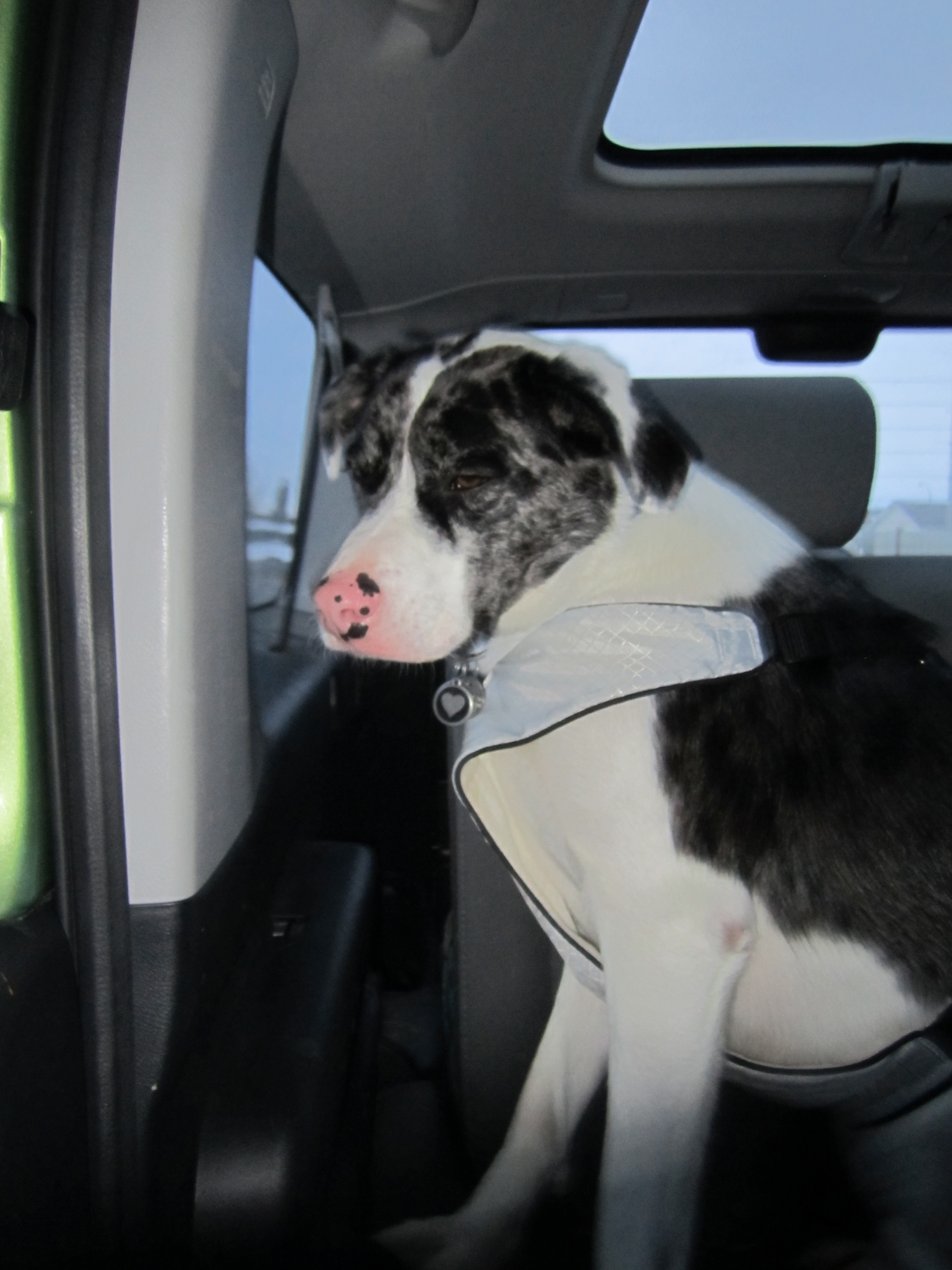 Usually, Sherm loves a car ride. He sits silently on his seat in the back, wearing his doggie seatbelt and watching the world zing by his window. After the kennel, he is largely disinterested in whatever everyone else it up to: he just wants to get the snoring started.