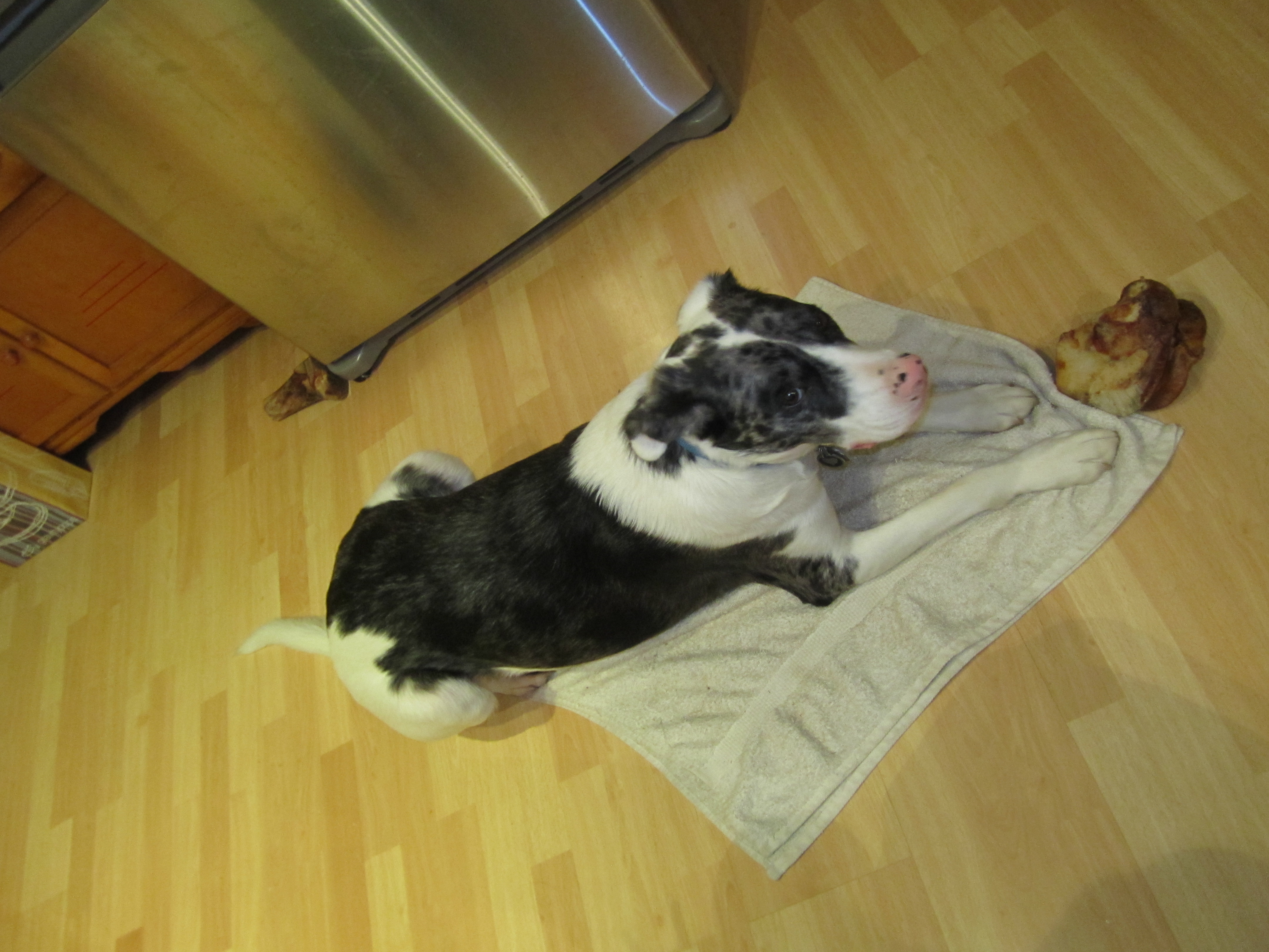 Now, we wait. Sherman took it upon himself to enjoy foods, like pineapple, that are complete foreigners to his digestive tract. There’s also the not insignificant issue of the raisins in those muffins. Grapes and their progeny are highly toxic to dogs, even when swallowed whole and surrounded by cinnamon and nutmeg. I’ll be watching the speckled one for the next couple days to see how he does.