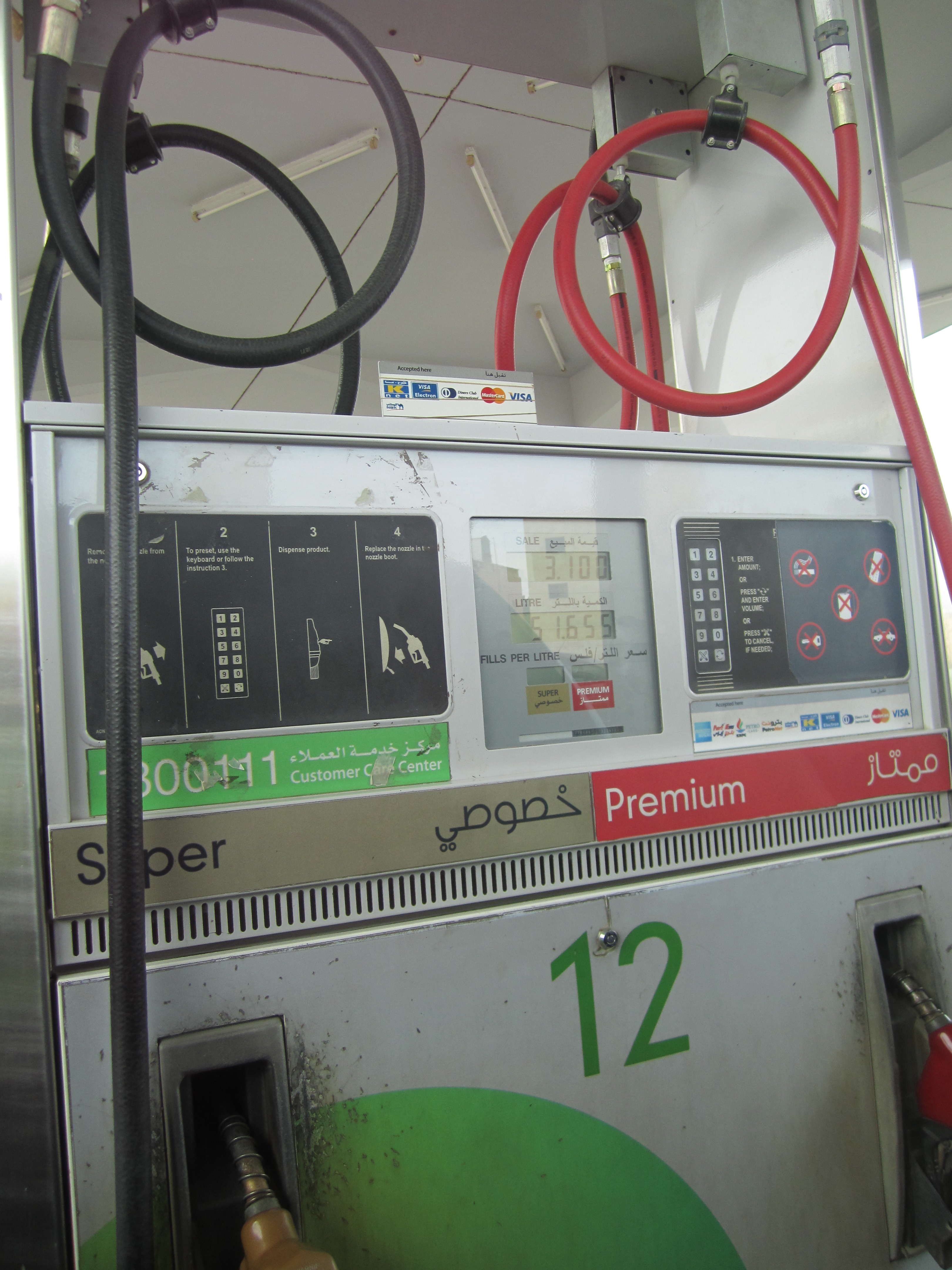 A big part of the problem on Kuwait’s streets and highways is the price of fuel. I took a photo of the pumps after the gas station attendant finished filling us up today.