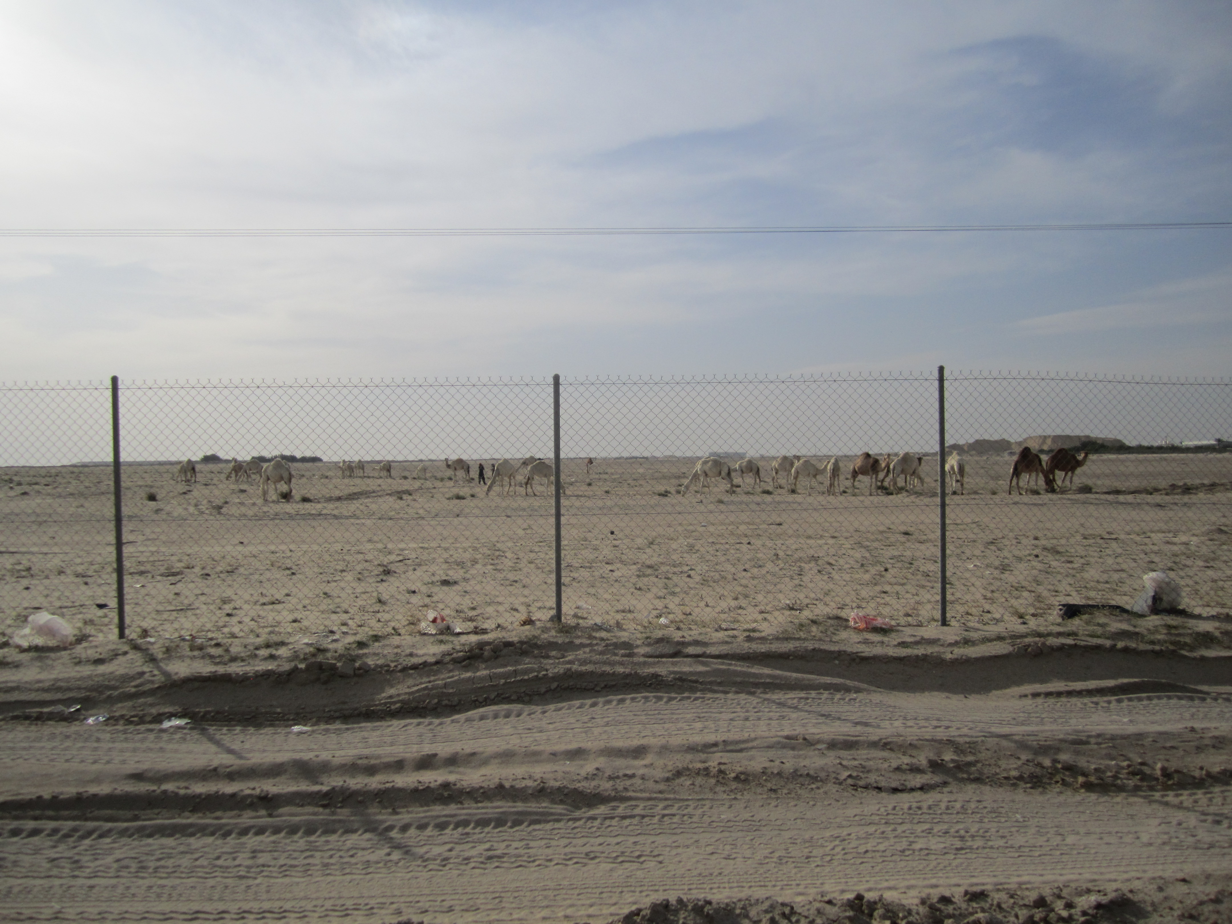 I can’t very well take a trip to a city on the edge of a massive desert without writing about some of the local wildlife, can I? While driving to an outlying city for lunch, which involved a large, scary highway and mile after mile of sand and rubble, The Electrician’s mom hollered, “There! Camels!” Immediately, The Electrician’s dad slowed down, threw the truck into 4×4, and pulled off onto the shoulder of the highway. Just so you know, the shoulder of the highway in a desert is basically an expanse of mini sand dunes. There, behind the 8-foot chain link fence that borders the highway, a herd of camels were grazing on whatever edible vegetation they could scrounge.