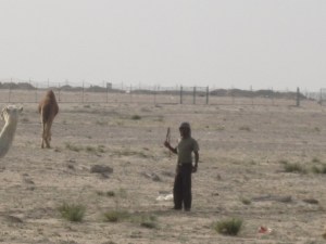 I’m not sure what the actual term for a peaceful group of camels is, but we’re going with “herd” because it makes sense. Also, there were two fellows we’re going to call camelherds (like shepherds, but more hump) taking care of the camels and moving them about with long whips. I’m not sure what the objective is of shuffling a group of camels around a dry, sandy area with no obstacles except the highway, which is sectioned away from the “pasture” by a fence. Perhaps Joe’s only motive is to keep the group together, even if a person could see a stray camel for miles out here.