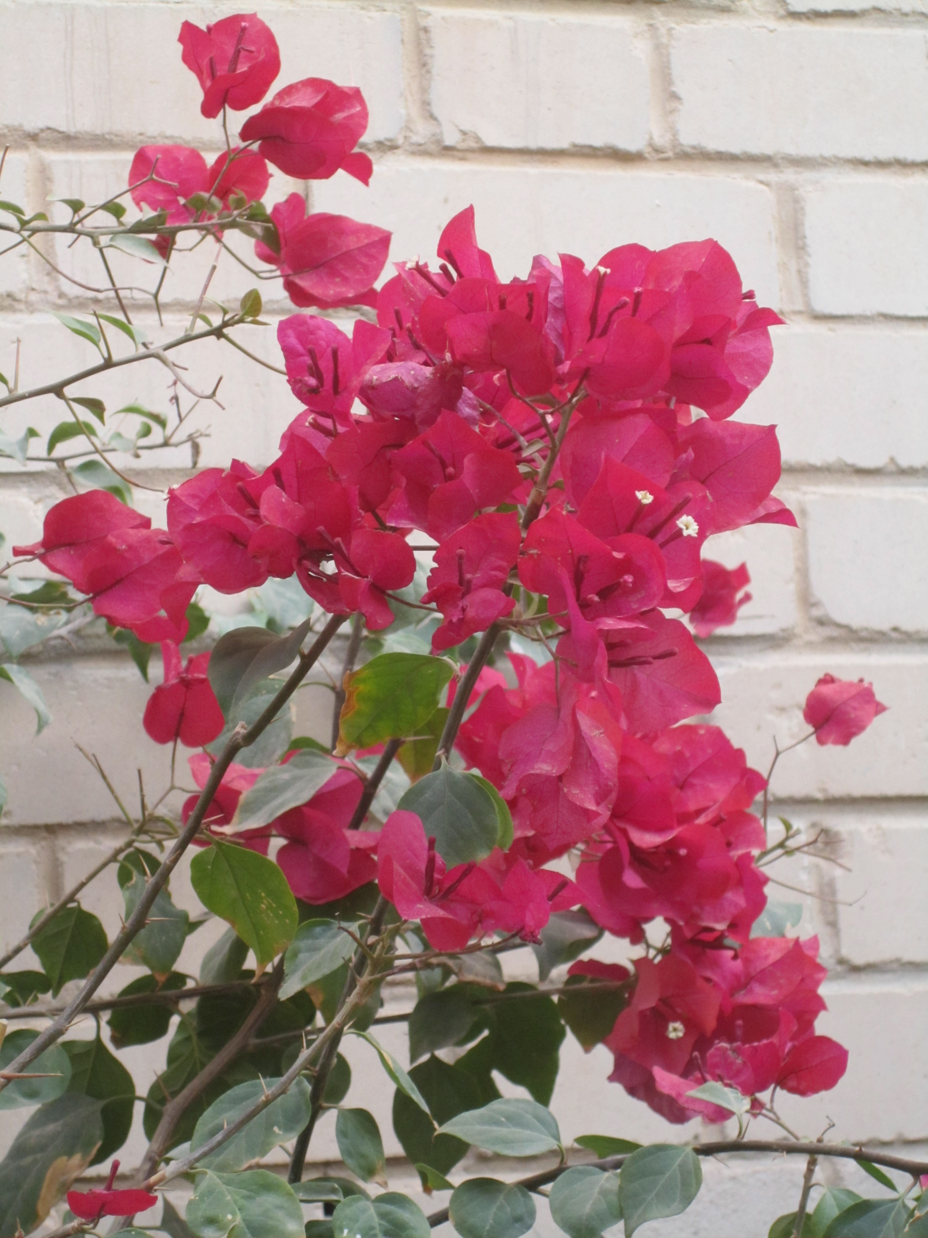 The flowering vine is bouganvilla (sp.) and grows all over California hillsides, with very sharp thorns, and sheds in the fal/winter.