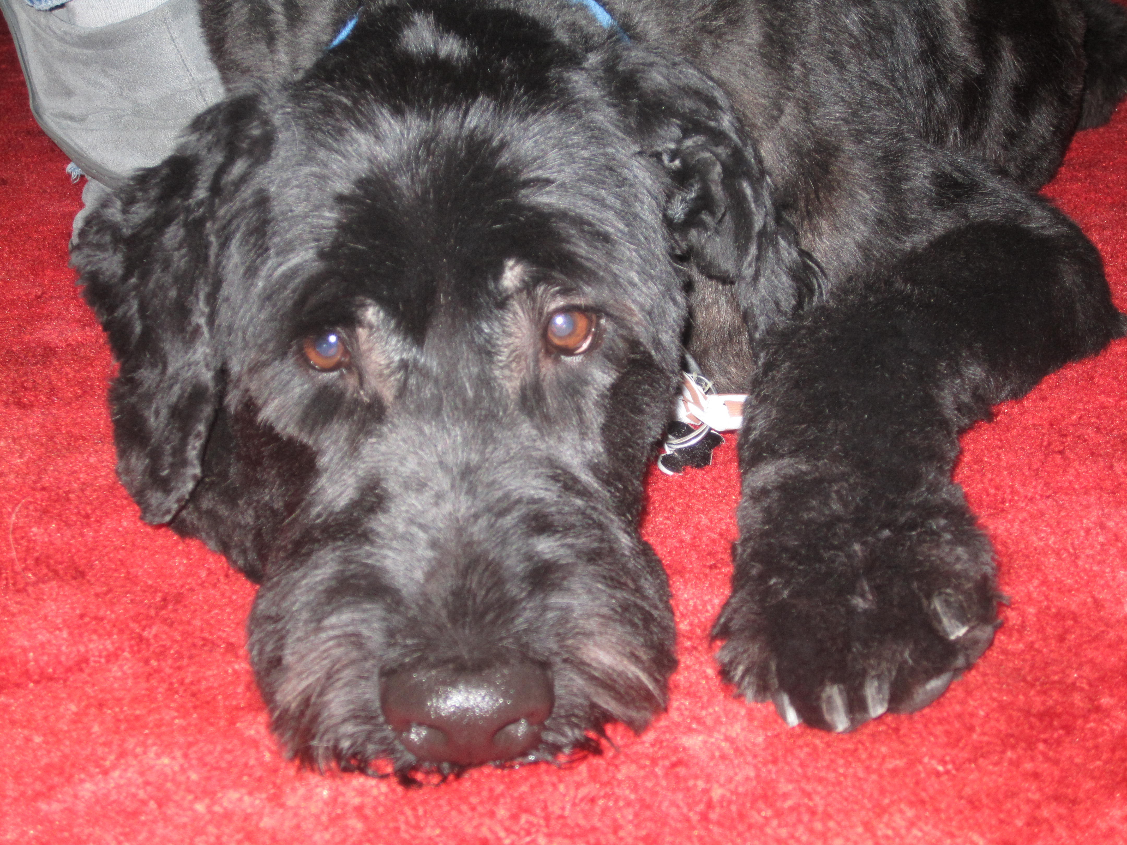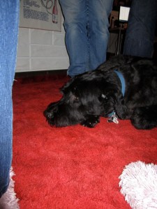 Odin’s a gentle giant, and he’s the first French Briard I’ve ever known. He’s like Ferdinand the Bull, and he and Sherman together are a rather odd couple. Before long, while Odin napped on the unbelievably cool crimson sculpted carpet in Miss Sassy and Comic Book Fan’s new medieval castle (trust me, it really is) themed rec room, Sherman really cut loose.
