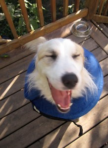 Poor Gwynn! I always feel so bad for doggies in the cone. It’s such an undignified way to go through healing.