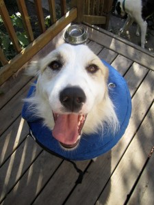 I stopped after work tonight to pick up a magical inflatable dog collar, rumoured to prevent wound licking and incision aggravation. The new collar is made by Kong and it’s called the Cloud. It was an instant success! Quest relaxed as soon as I finished fastening the blow-up ring around her neck. Luckily, her own collar threads through the Cloud, so she is securely clipped into the thing without the need for extra hardware. The folks at Kong don’t have a clue who I am and have not asked me to review their product, but I am eager to recommend this fantastic alternative to the traditional “clunk, scrape, and gouge” plastic cone because it’s working so well for us. Check out our happy foster mutt: