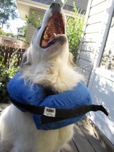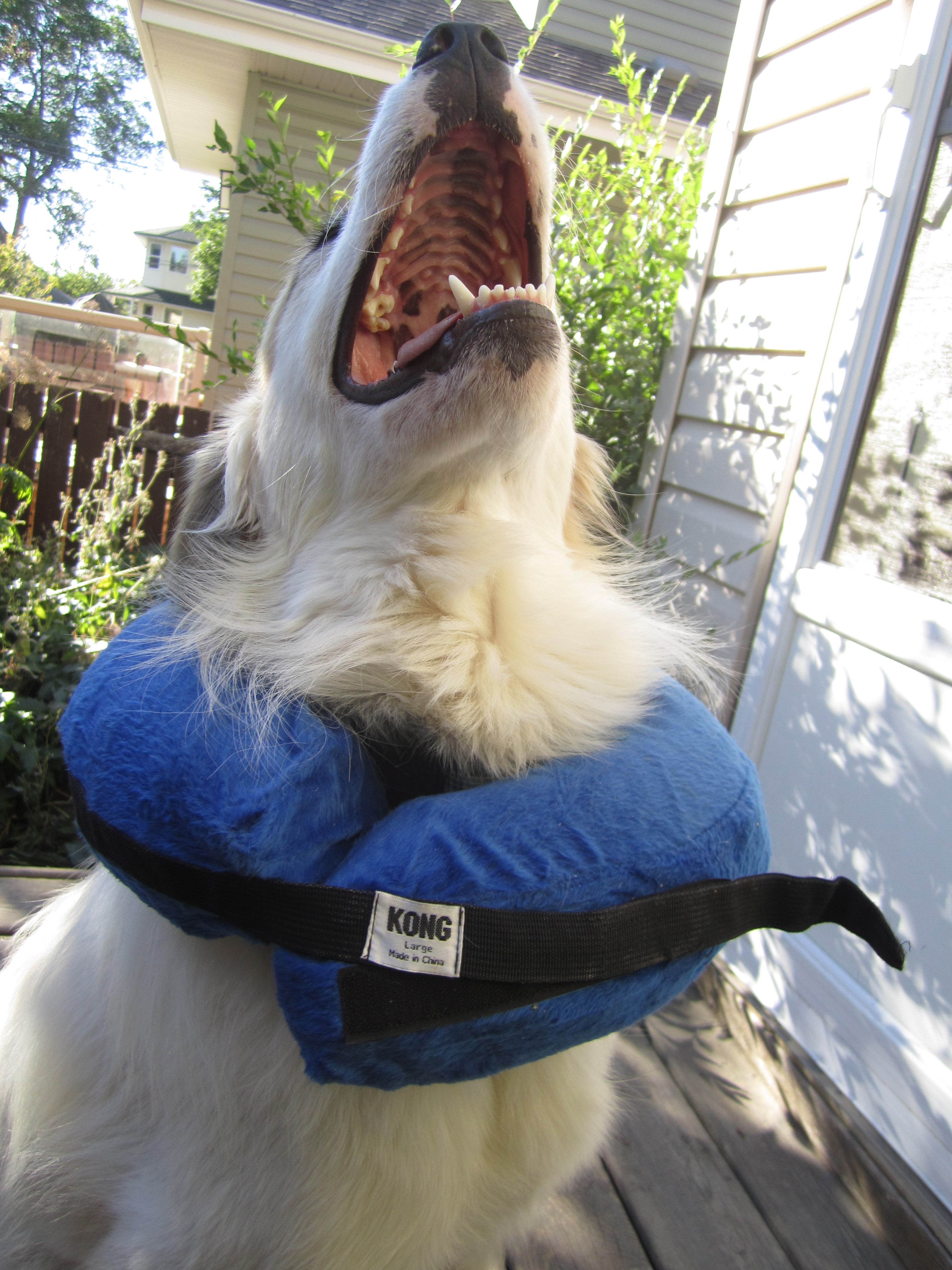 You know, if the Kong company would like to donate some of these awesome collars, I bet they would come in handy for rescue dogs all over the place. These poor babies don’t need any more stress, and something as simple as an alternative to the cone of shame could really make recovery easier on them. Kong people, drop me an email and I’ll get you in touch with the right people if you’d like to donate to SCARS, the organization we foster with.