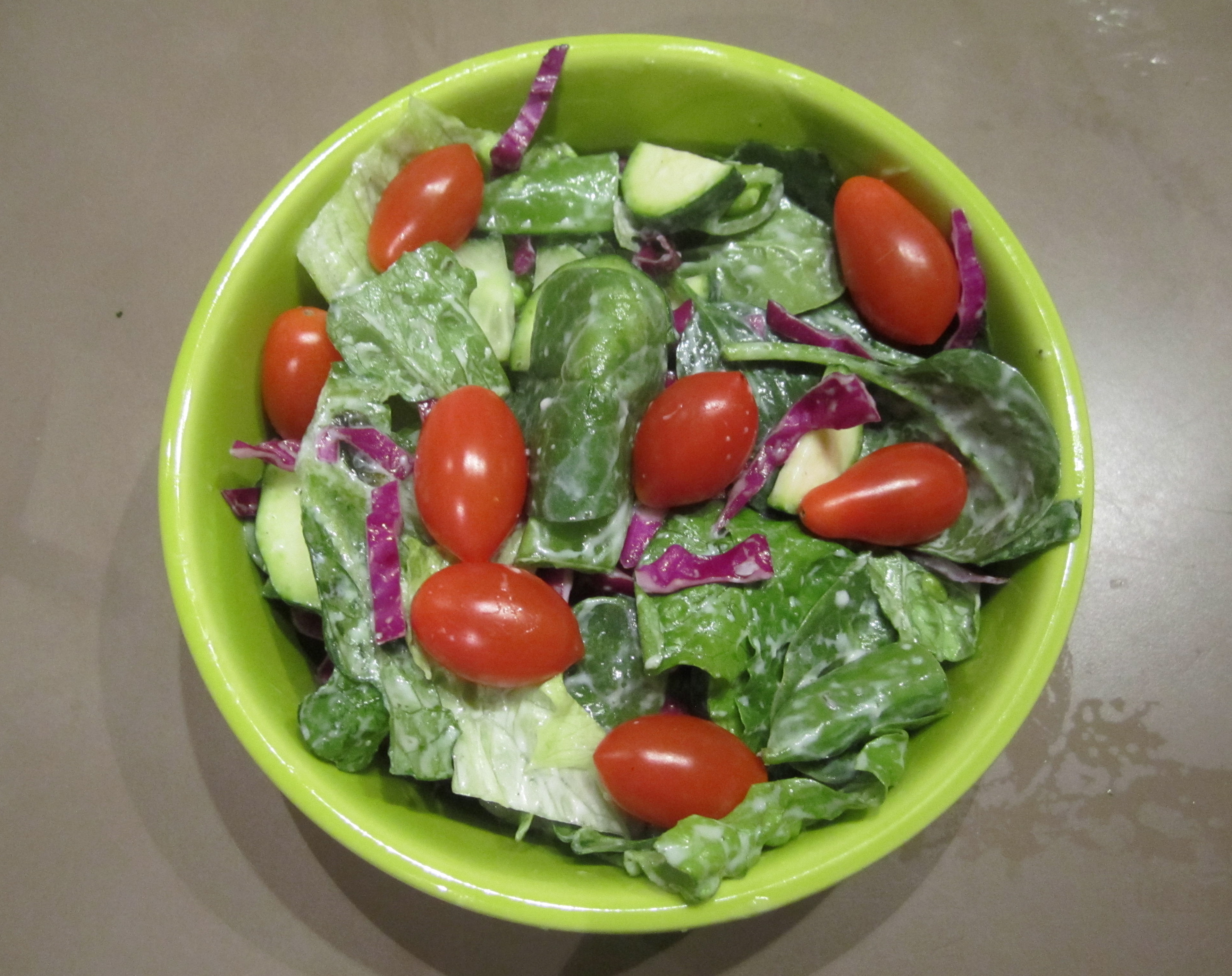 The cloves of garlic I used to make the dressing (only two) were fresher than I anticipated, so the salad bit back, but that’s okay. I’ve heard garlic is good for all kinds of ailments, so our salad tonight was extra-super healthy, and also vampire-proof.