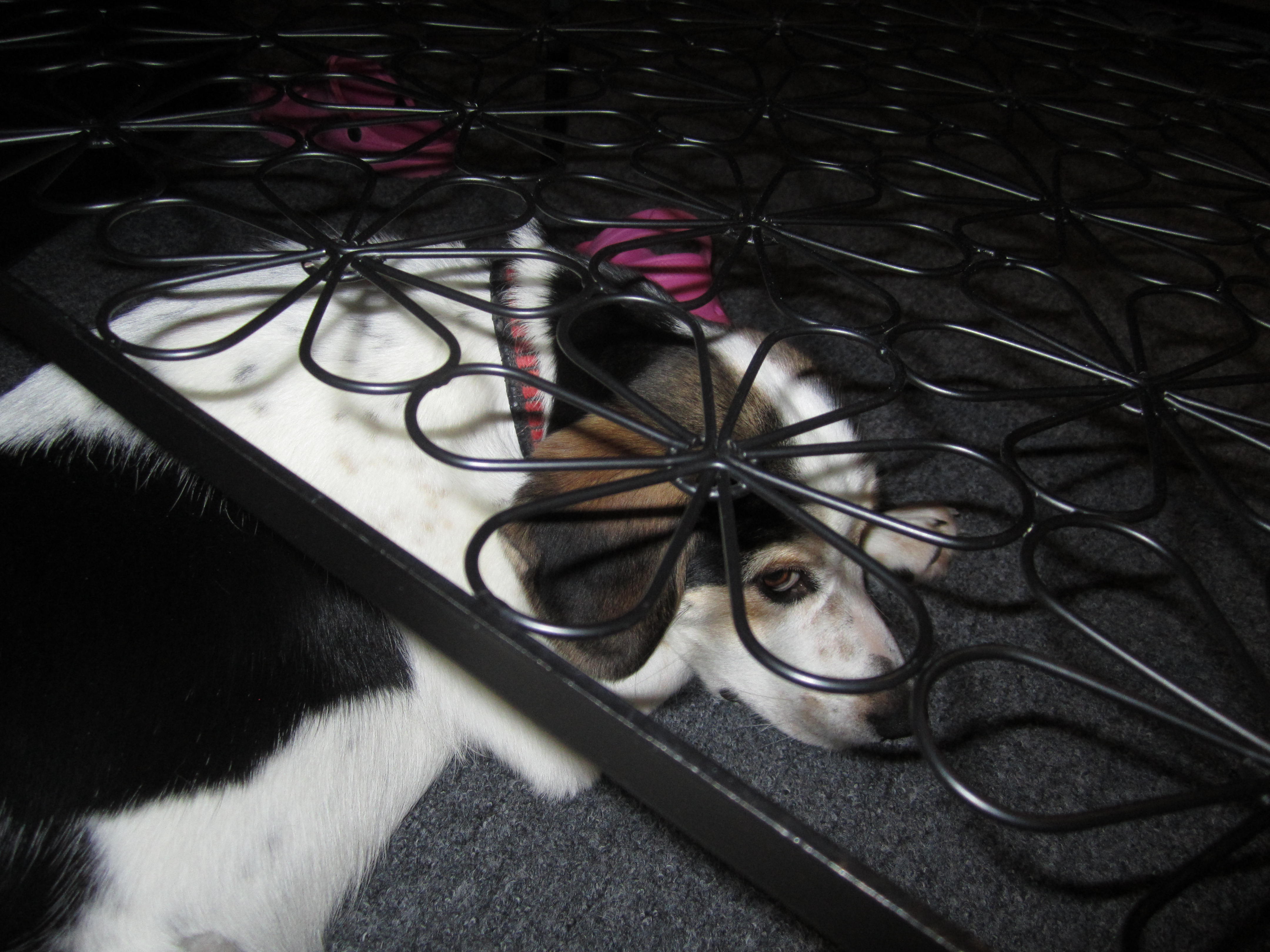 I’m not sure if it’s because she lived a life less pampered before coming to us, or if she just takes more after the ant than the grasshopper, but Miss Vana tends to hide her food and goodies for later on. So far, I’ve uncovered partially gnawed rawhides behind most of my furniture, tucked into corners, and buried in the dirty laundry. In a seriously stealthy and verbotten move, Vana also “buried” a chewy under all seven pillows (four regular, two shams, and a decorative throw featuring a peacock) on our basement spare room bed. Dogs are never allowed on the furniture around here, so I’m not sure when Vana managed to sneak it up there, hide it on the fitted sheet, and replace all the pillows exactly as she found them, but she’s obviously a wily little creature. This morning, she even tried to hide her food dish, complete with kibble, in the hall closet. I heard something scraping and poked my head out of the bathroom to find her pushing the bowl into the closet with her snout. When I asked her what she was doing, she gave me an innocent “who, me?” look and pretended to be admiring herself in the mirror.