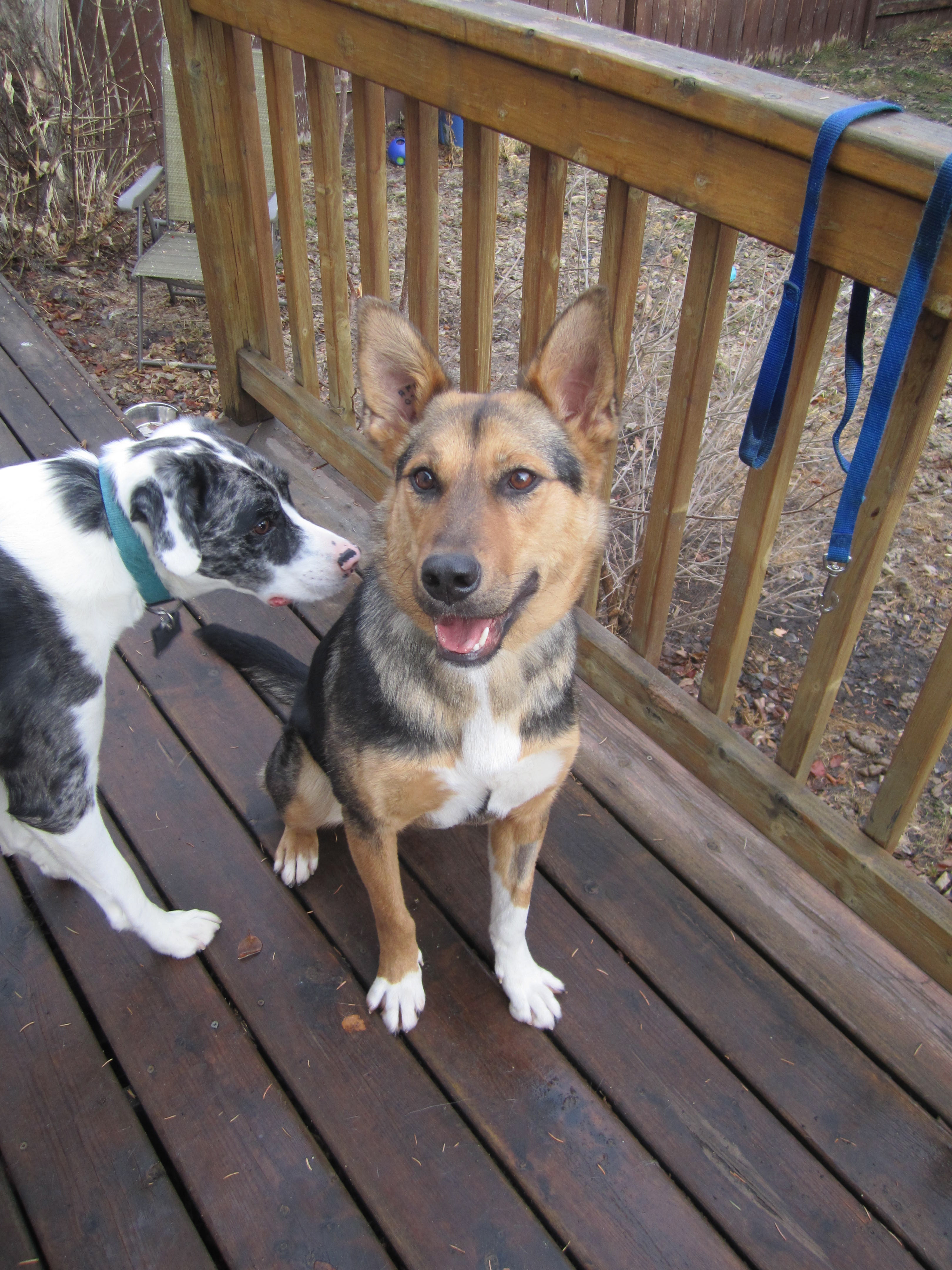 Mizz Kizz is clearly some sort of shepherd mix–collie is my guess for the rest of the blend. She has great big satellite dish ears that I’m pretty sure get radio stations out of Utah on clear days. Her tail is shorter than you’d expect, but makes up in action what it lacks in length: that thing goes round and round like a propeller, pretty much all the time. I wish you could see her in person, so you could really appreciate how beautiful her markings are.