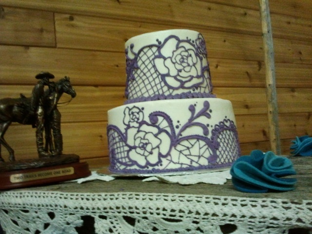 When I first saw the cake my friend hoped for, but with her own country chic twist, I’ll admit I was nervous. I know how tough it is to pipe very dark icing on a white cake, because it’s nearly impossible to fix mistakes. August in Alberta is hot and humid, and I’ve had nightmares over the last few weeks about a sagging wedding cake with purple drips of moisture turning it into some kind of matrimonial tie-dye mess.