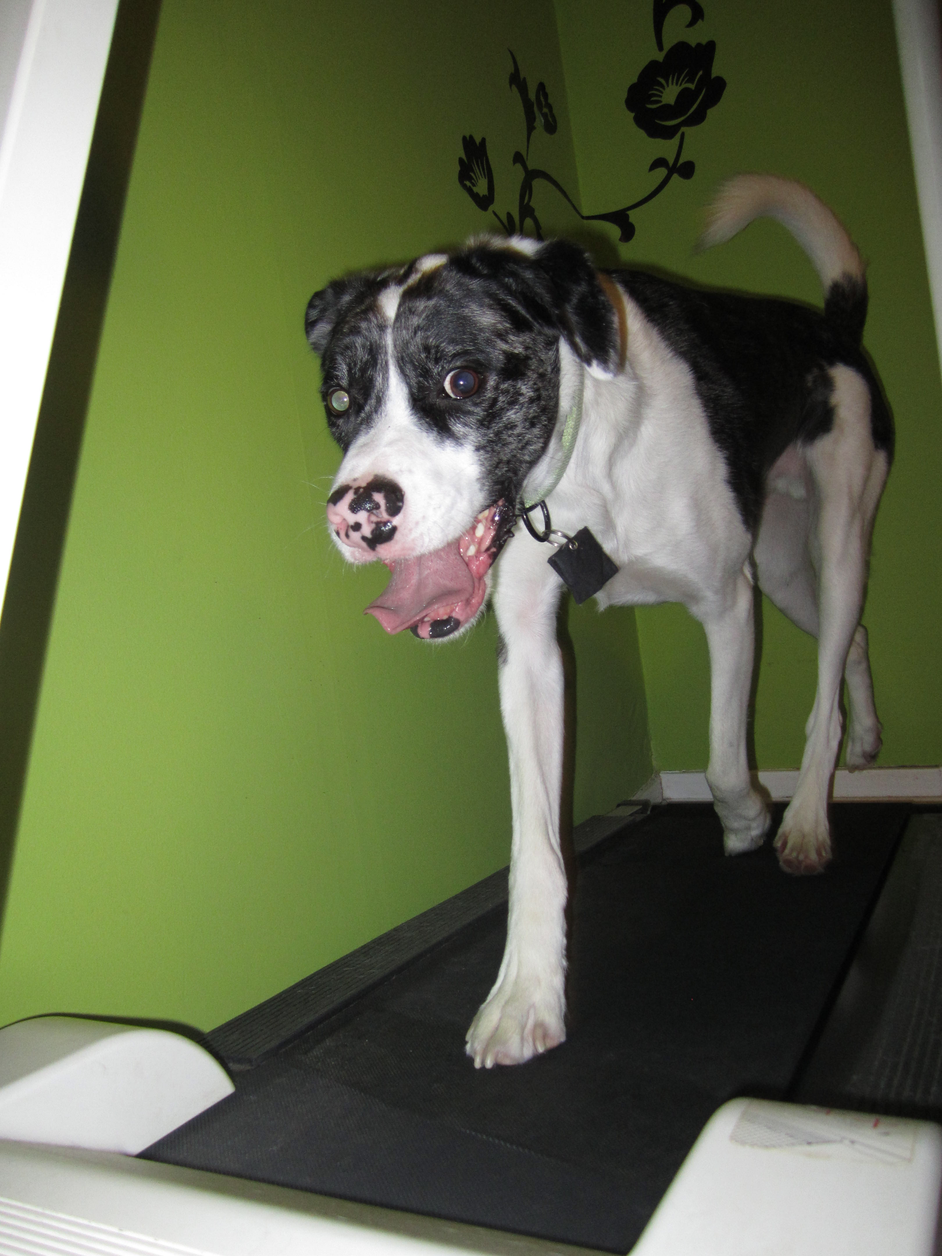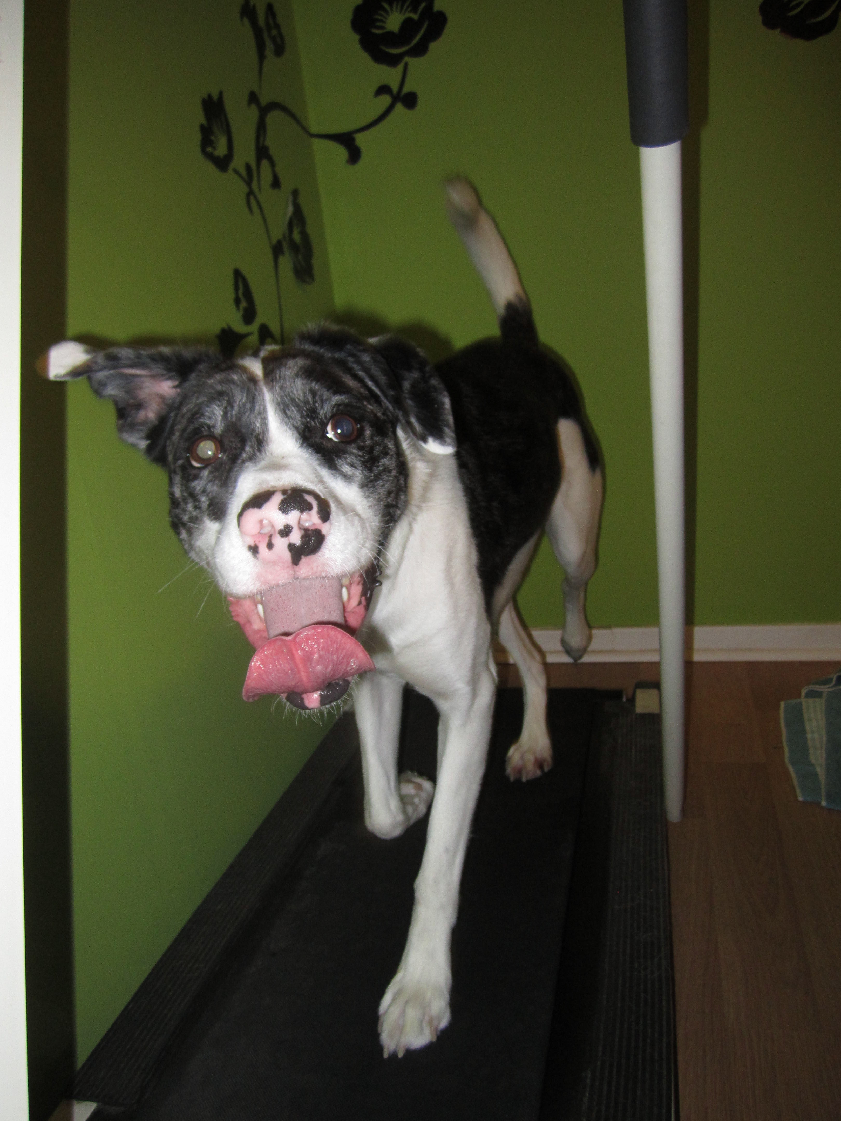 We get an extra kick out of watching his tongue grow in treadmill photos. Go back and take a peek; I swear one of these days he’ll trip on the thing. Add the fact that his doggy face is one of pure canine joy, and the treadmill remains a cost-effective win on all fronts.