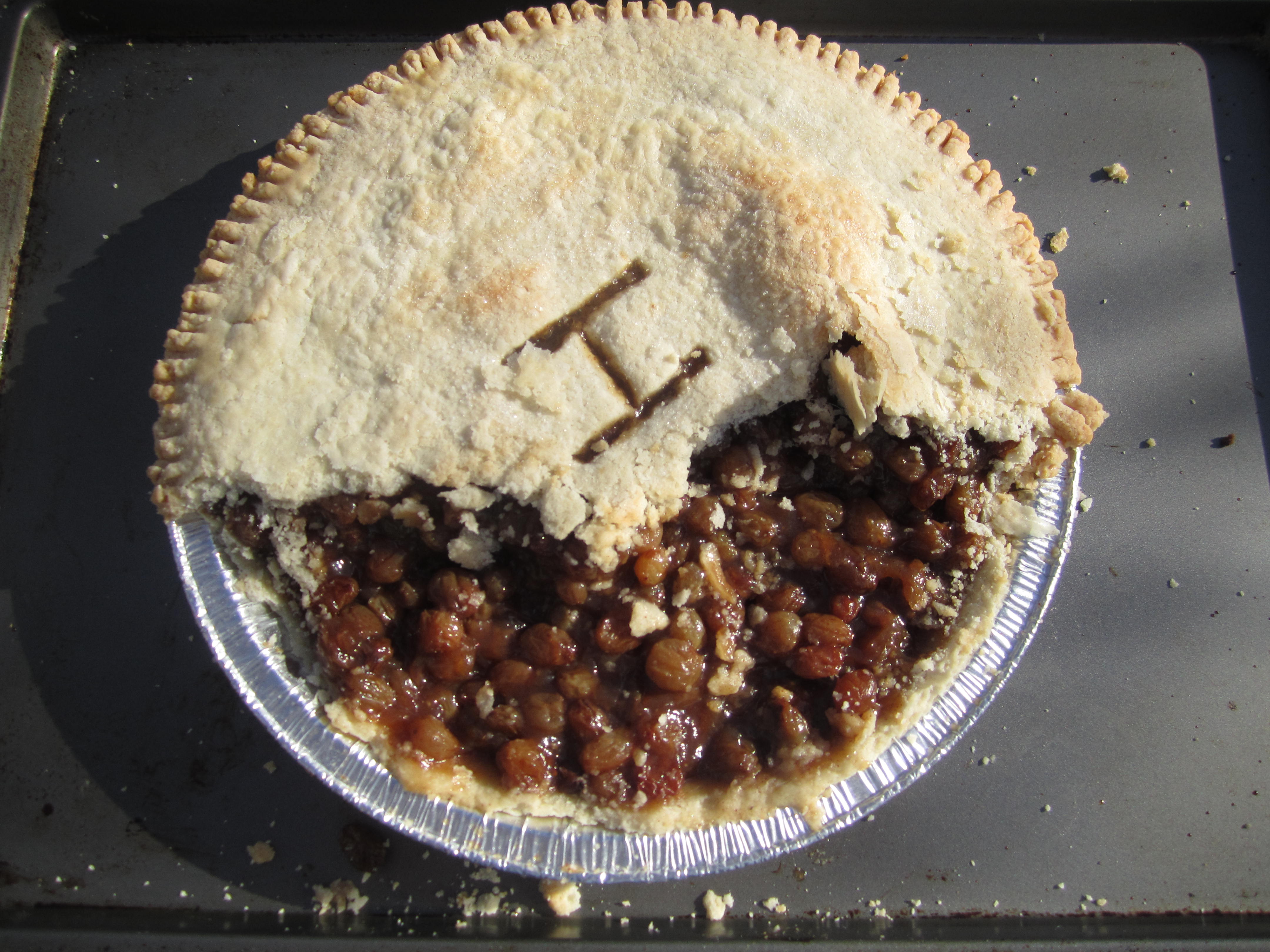 I baked The Electrician’s grandpa his favourite dessert, raisin pie, last night and left it out to cool overnight. As a bit of a joke, I cut the vents in the top crust in an “H” shape so the pie was labelled with Grandpa’s initial. What better than a custom, monogrammed pie, yes? I finished it late last night and left it out to cool while we slept.